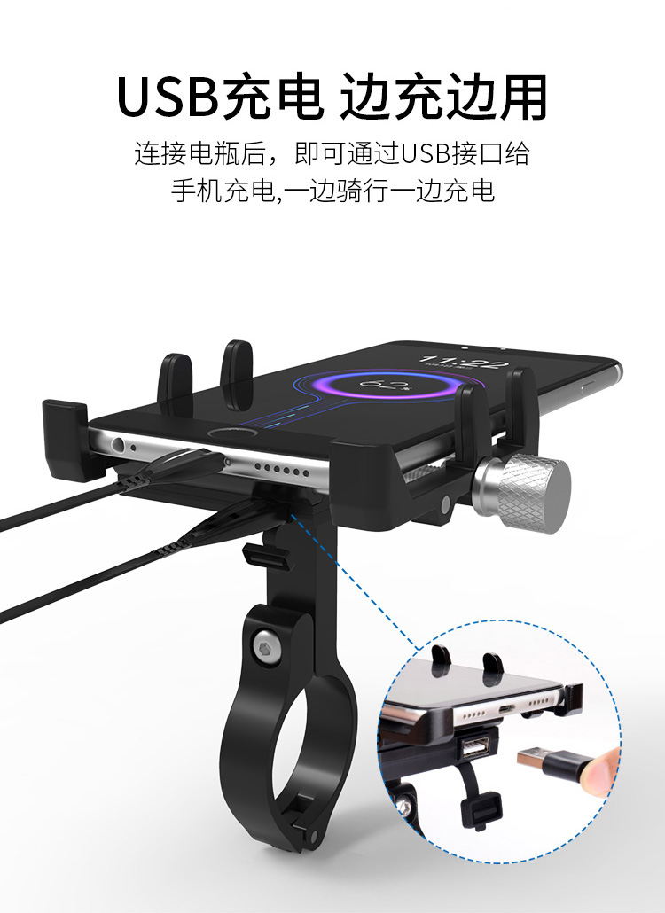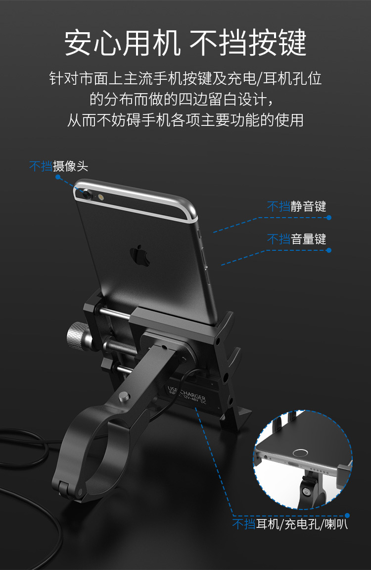 特點(diǎn):全鋁合金架體,四對(duì)位加長固定部+強(qiáng)化底托,更標(biāo)配穩(wěn)固綁帶,高兼容性不挑手機(jī)型號(hào),連接電瓶后可為手機(jī)充電,摩托車/電動(dòng)車等都可使用!