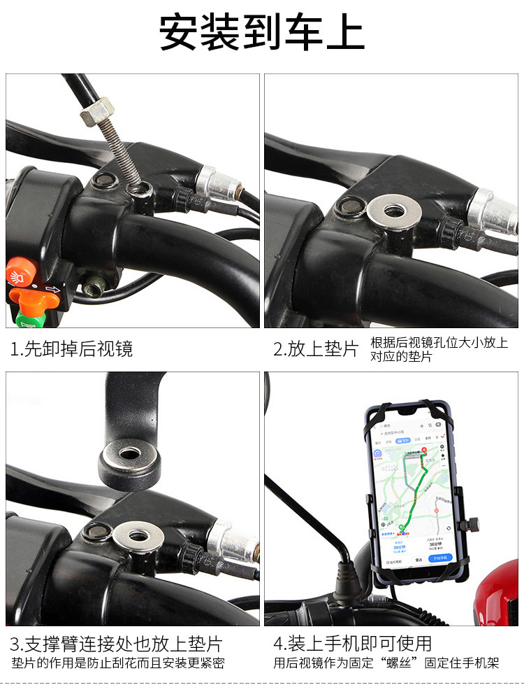 特點:全鋁合金架體,四對位加長固定部+強(qiáng)化底托,加粗支撐臂,支持360度旋轉(zhuǎn),更標(biāo)配穩(wěn)固綁帶,連接電瓶后可為手機(jī)充電,摩托車/電動車等都可使用!