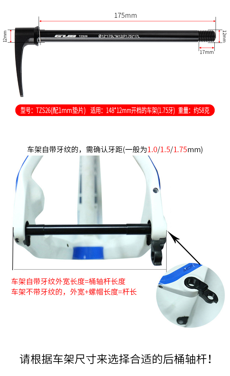 說明:請根據(jù)車架尺寸選擇合適的桶軸桿!