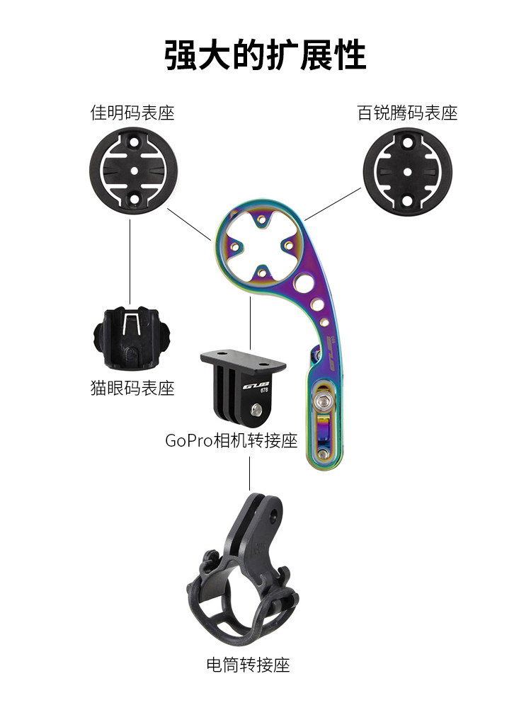 安裝在車把上,可伸縮設(shè)計,兼容佳明碼表,使用附帶的配件可兼容百銳騰碼表、貓眼碼表,另標(biāo)配運(yùn)動相機(jī)轉(zhuǎn)接頭和電筒轉(zhuǎn)接頭。