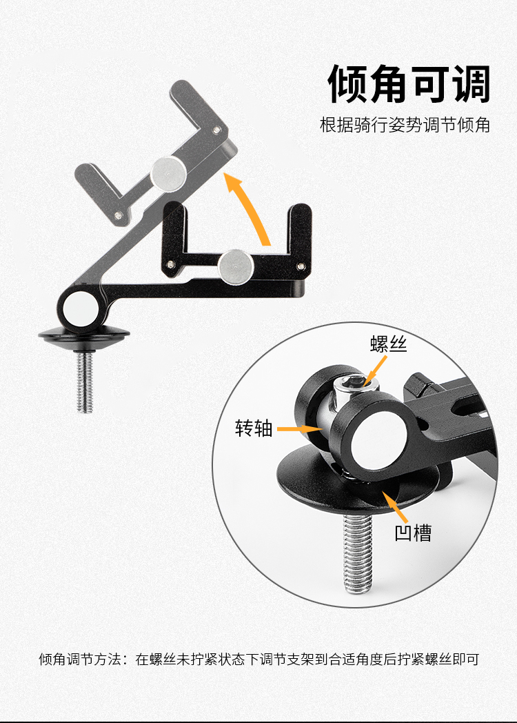 特點:全鋁架體,碗組蓋固定式安裝,節(jié)省車頭空間,可調(diào)傾角設計,根據(jù)騎行姿勢選擇合適角度,螺旋式固定手機,加長固定爪,穩(wěn)定不掉。