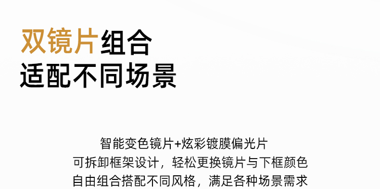 特點(diǎn):標(biāo)配透明變色片,另贈(zèng)送一副偏光鏡片和下框,一副眼鏡,四種顏色搭配,滿足個(gè)性需求。專利設(shè)計(jì)上下可拆卸框,快速更換鏡片。