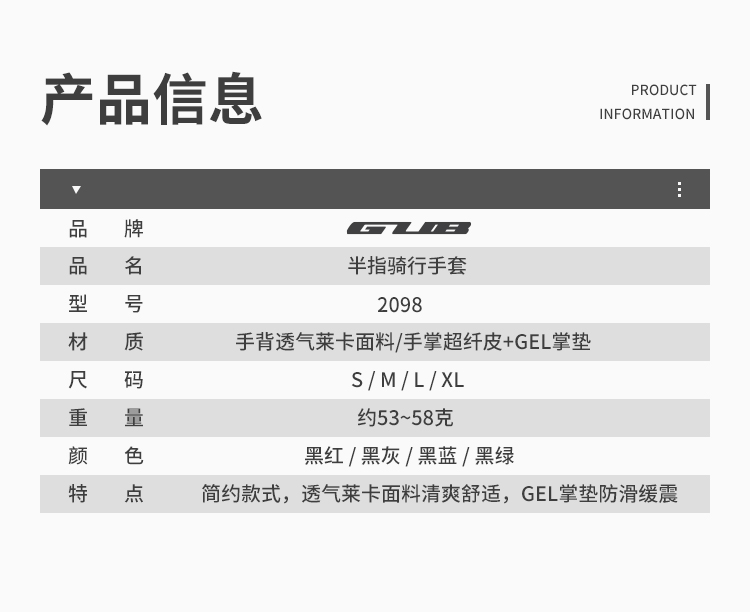 產(chǎn)品名稱:GUB 2098手套 可選顏色:黑紅、黑灰、黑綠、黑藍 可選尺寸:S碼 M碼 L碼 XL碼 XXL碼 毛重:約53-58克