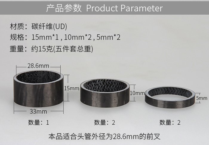 產(chǎn)品名稱:TC-004碳纖墊圈 規(guī)格:15mm一個(gè),10mm兩個(gè),5mm兩個(gè) 外觀:碳纖維UD布 總重:約15克