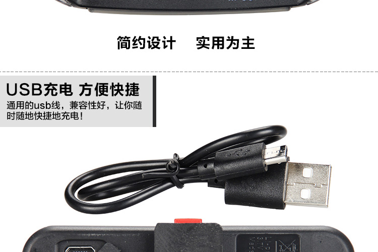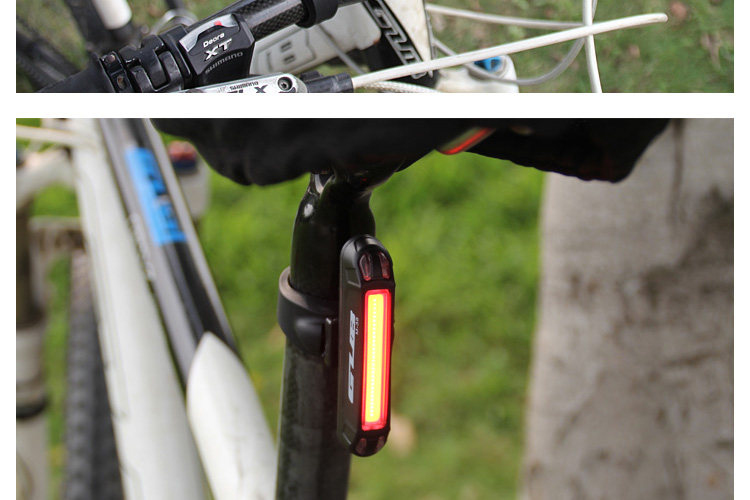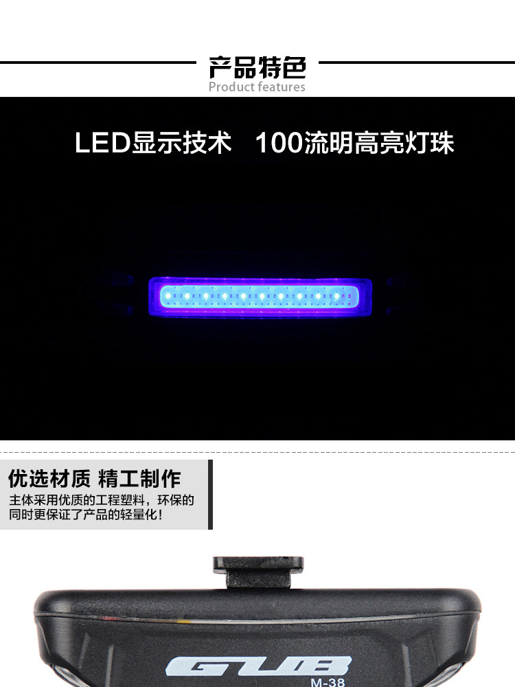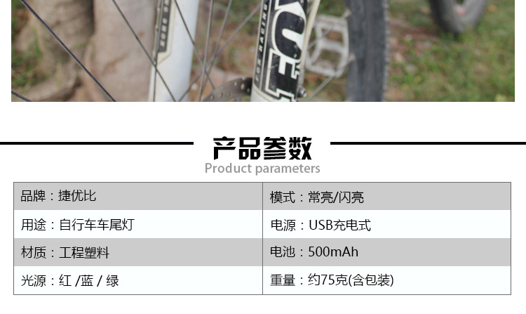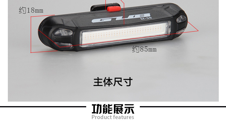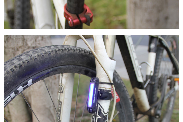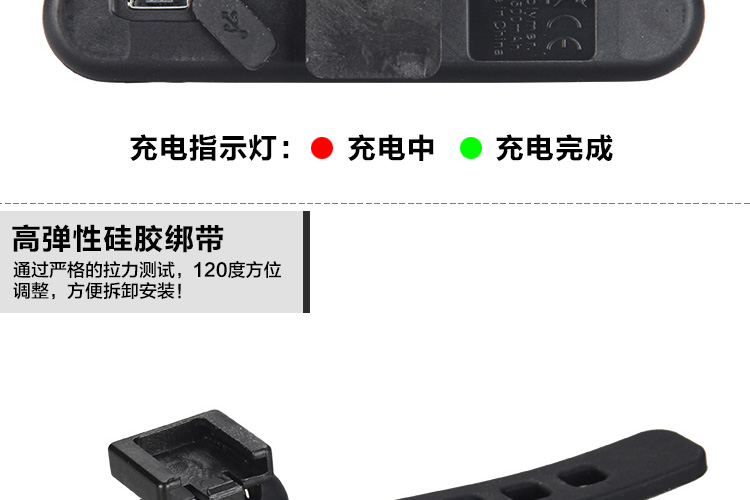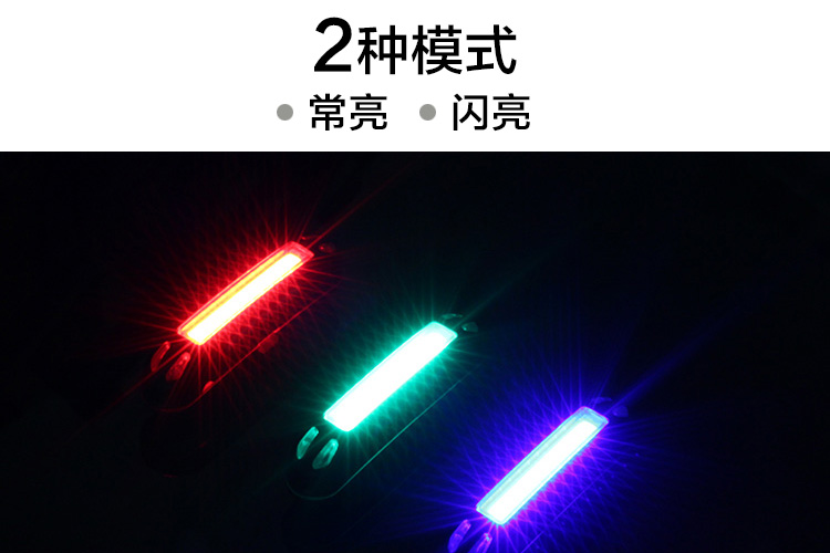 特性:LED技術,COB整面發(fā)光,高亮100流明設計,實現(xiàn)整體流暢設計;配備USB接口,可循環(huán)充電;2種模式7種效果可循環(huán)切換;電池自動保護功能,電壓低于2.8V不工作;硅膠捆扎固定方式,120度方位調整,方便拆卸安裝;方型背扣設計,可橫向和縱向不同角度安裝;可安裝在坐管,下叉,車把手,前叉等。