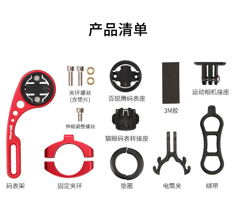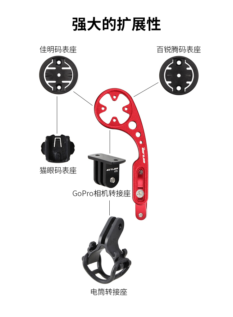 安裝在車把上,可伸縮設(shè)計,兼容佳明碼表,使用附帶的配件可兼容百銳騰碼表、貓眼碼表,另標(biāo)配運動相機轉(zhuǎn)接頭和電筒轉(zhuǎn)接頭。