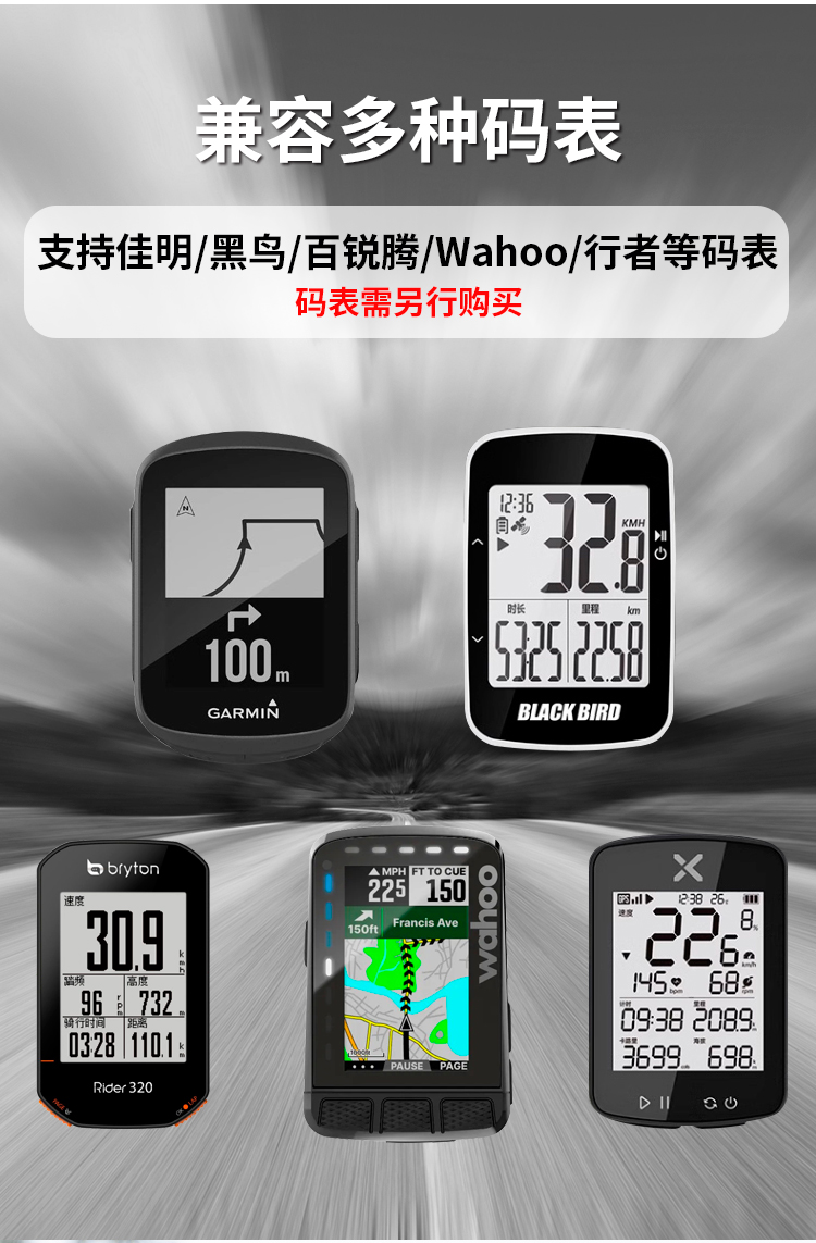 支持碼表:GARMIN全系列(兼用行者/黑鳥(niǎo)/iGPS等),貓眼全系列,WAHOO系列,百銳騰系列