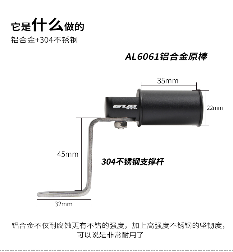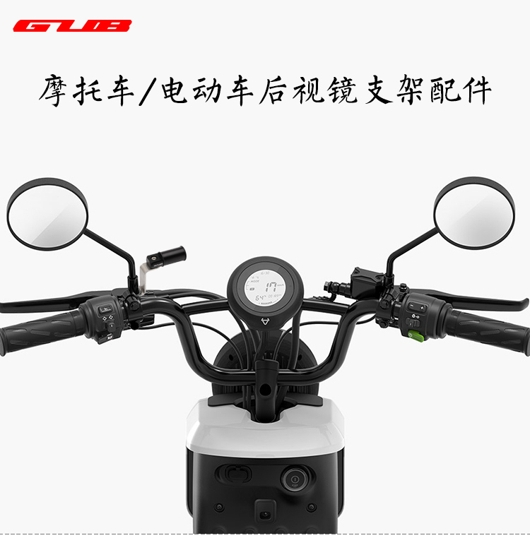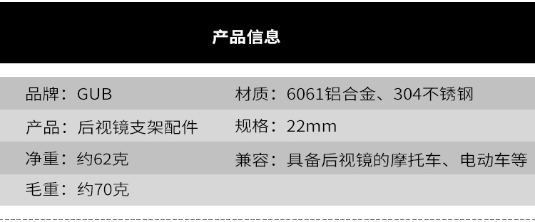 名稱:GUB摩托車后視鏡支架配件 材質(zhì):AL6061鋁合金+304不銹鋼 重量:約62克(凈重),約70克(透明膠袋包裝) 統(tǒng)一零售價(jià):28元