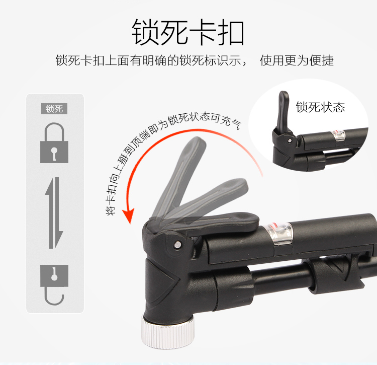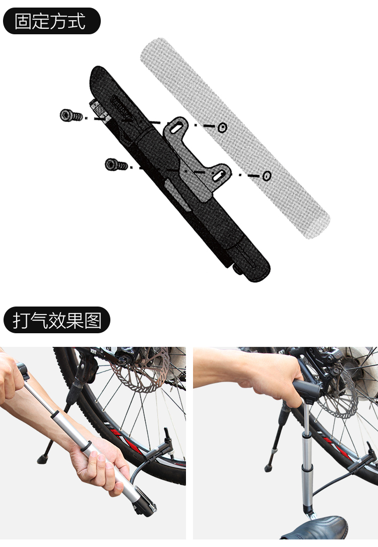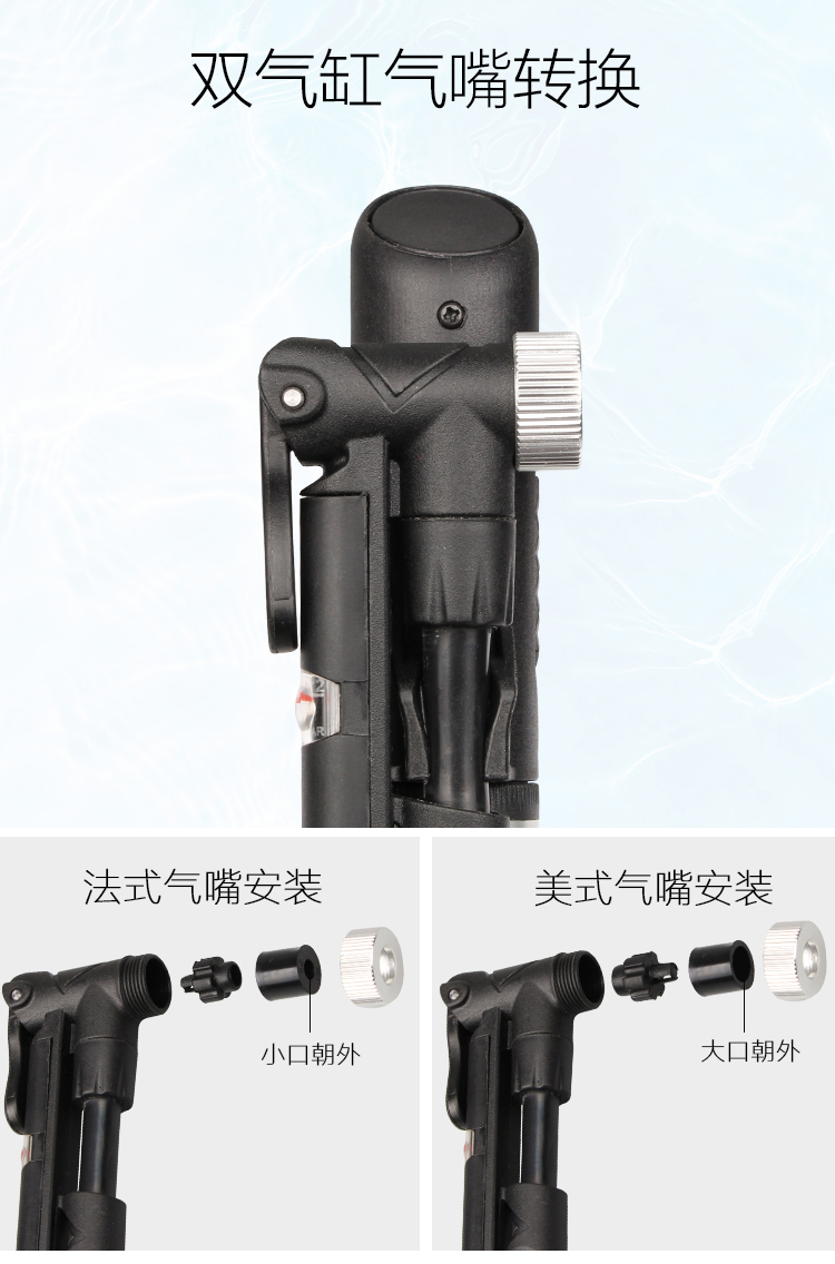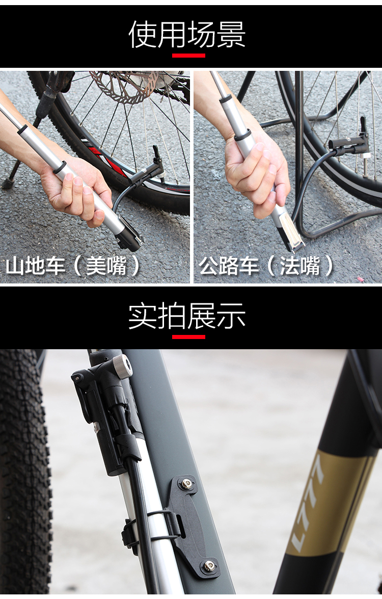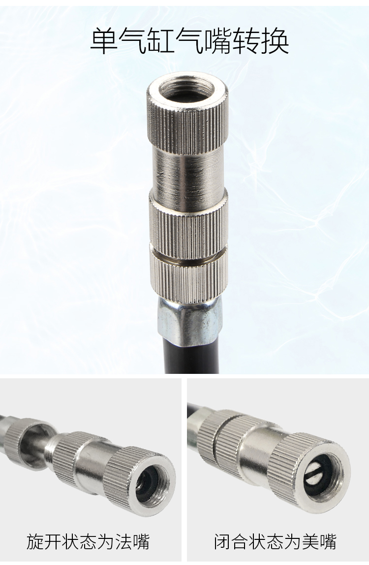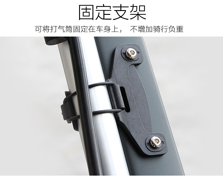 特點:鋁合金氣缸,體積小不占地方,美嘴法嘴兼用,帶固定支架可安裝在車架上