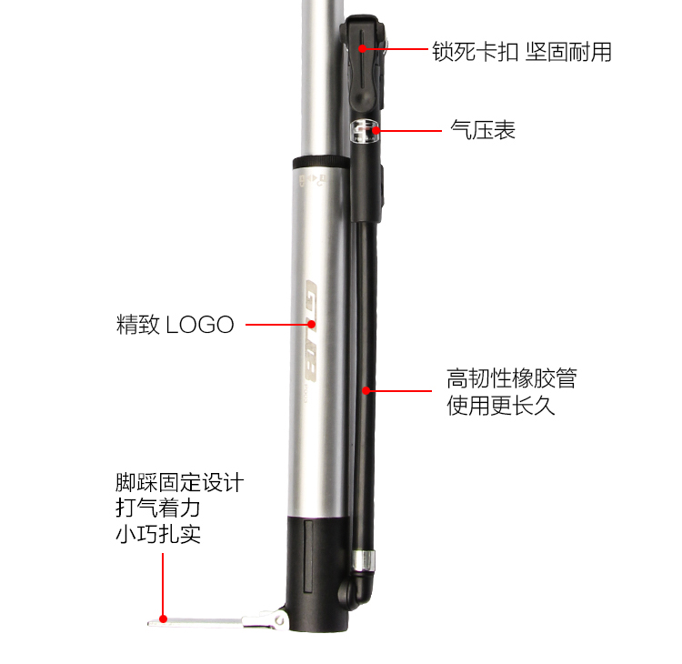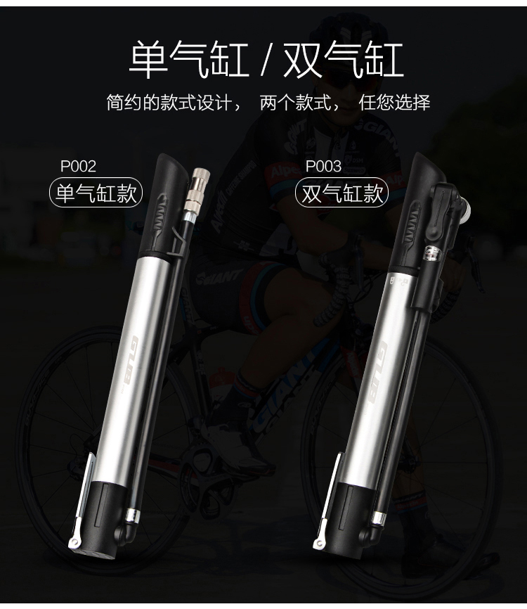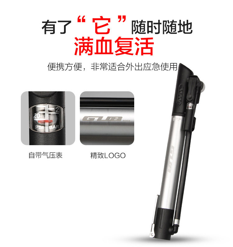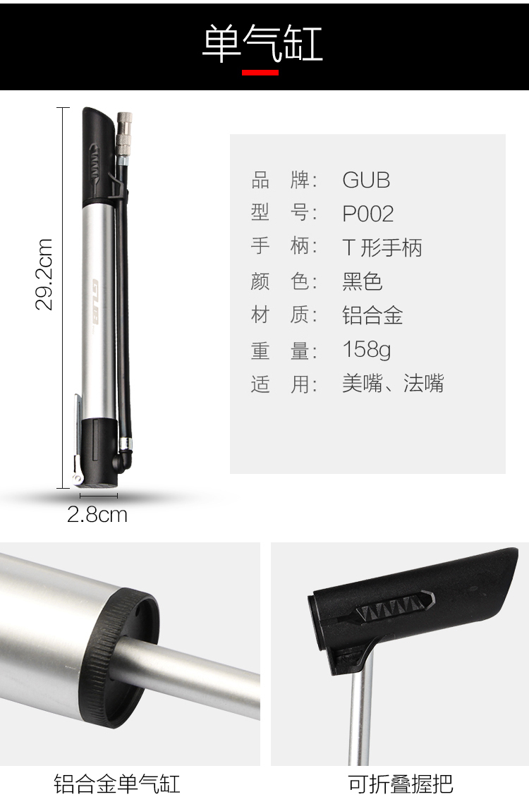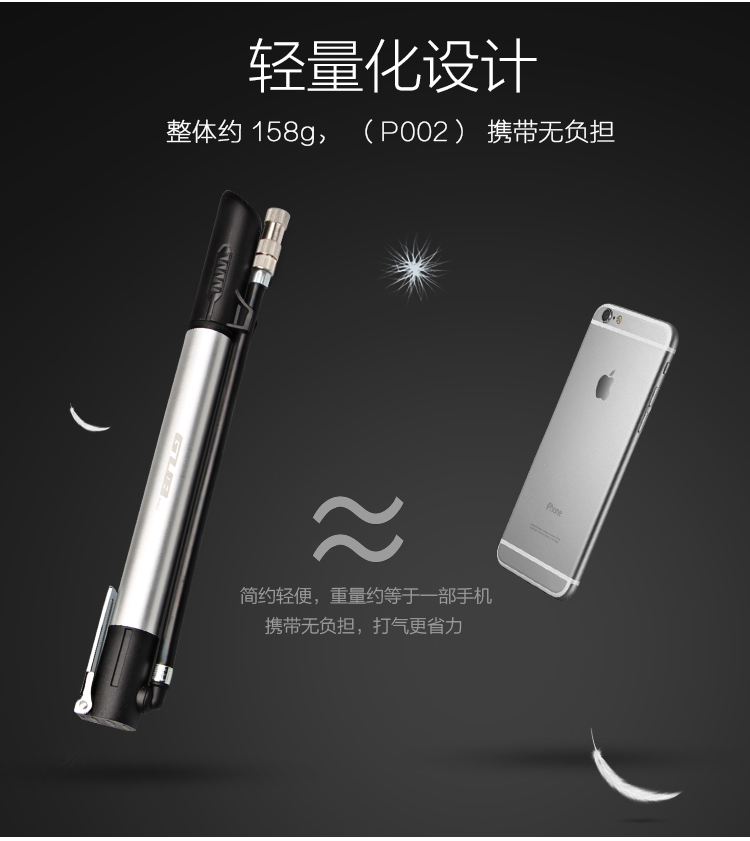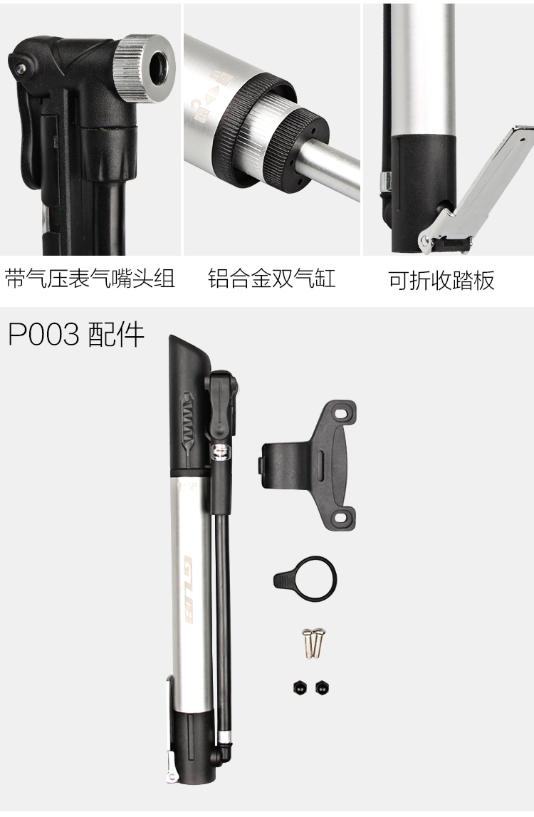 特點:鋁合金氣缸,體積小不占地方,美嘴法嘴兼用,帶固定支架可安裝在車架上