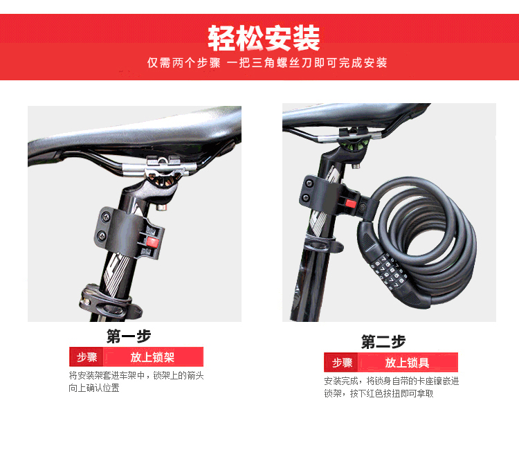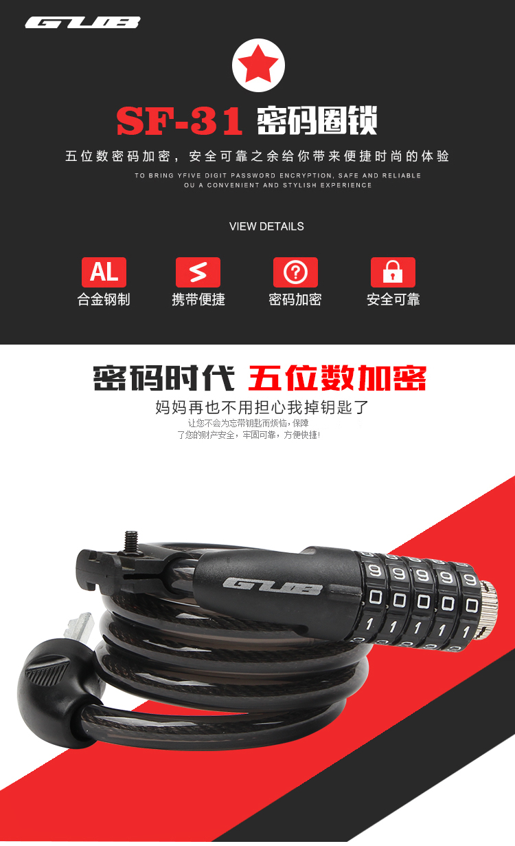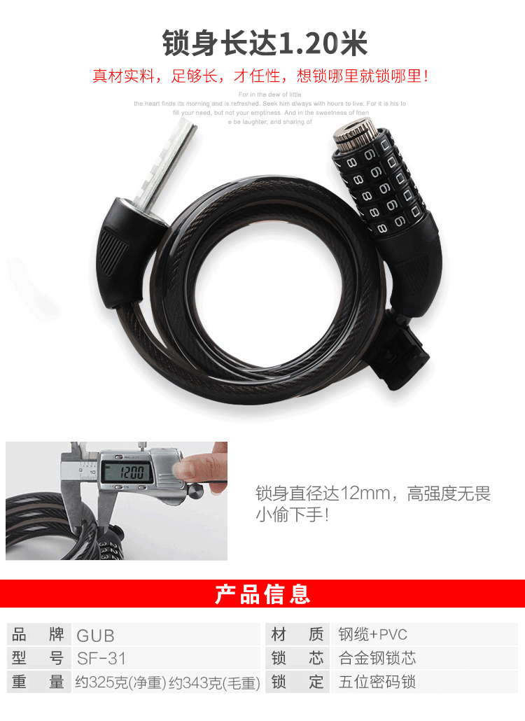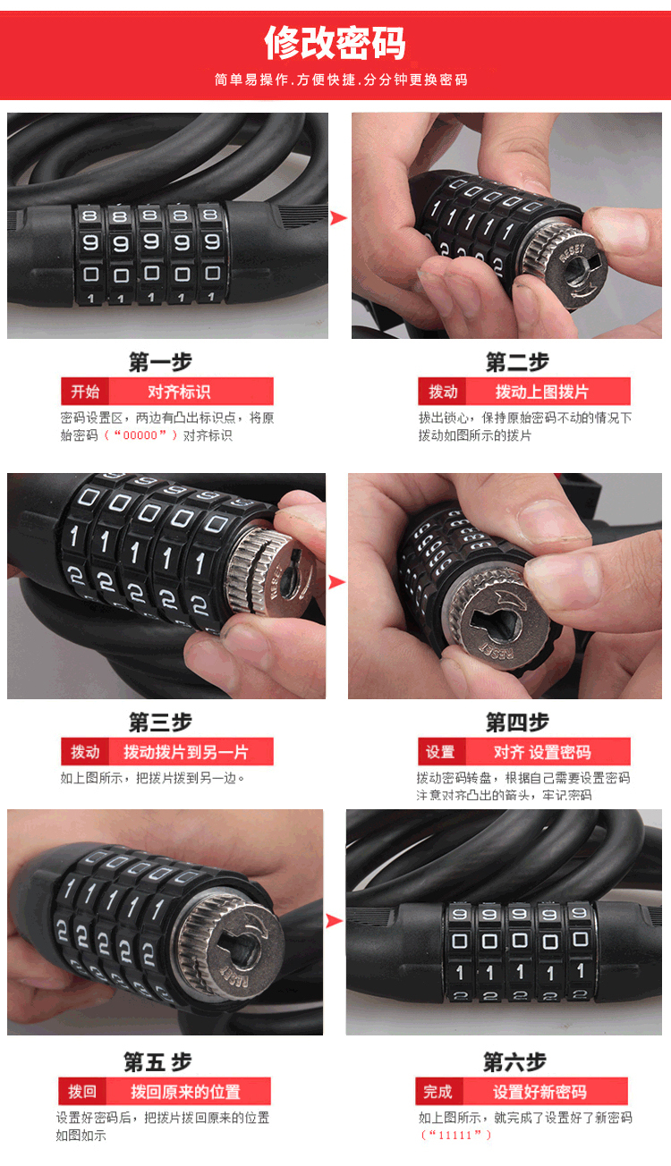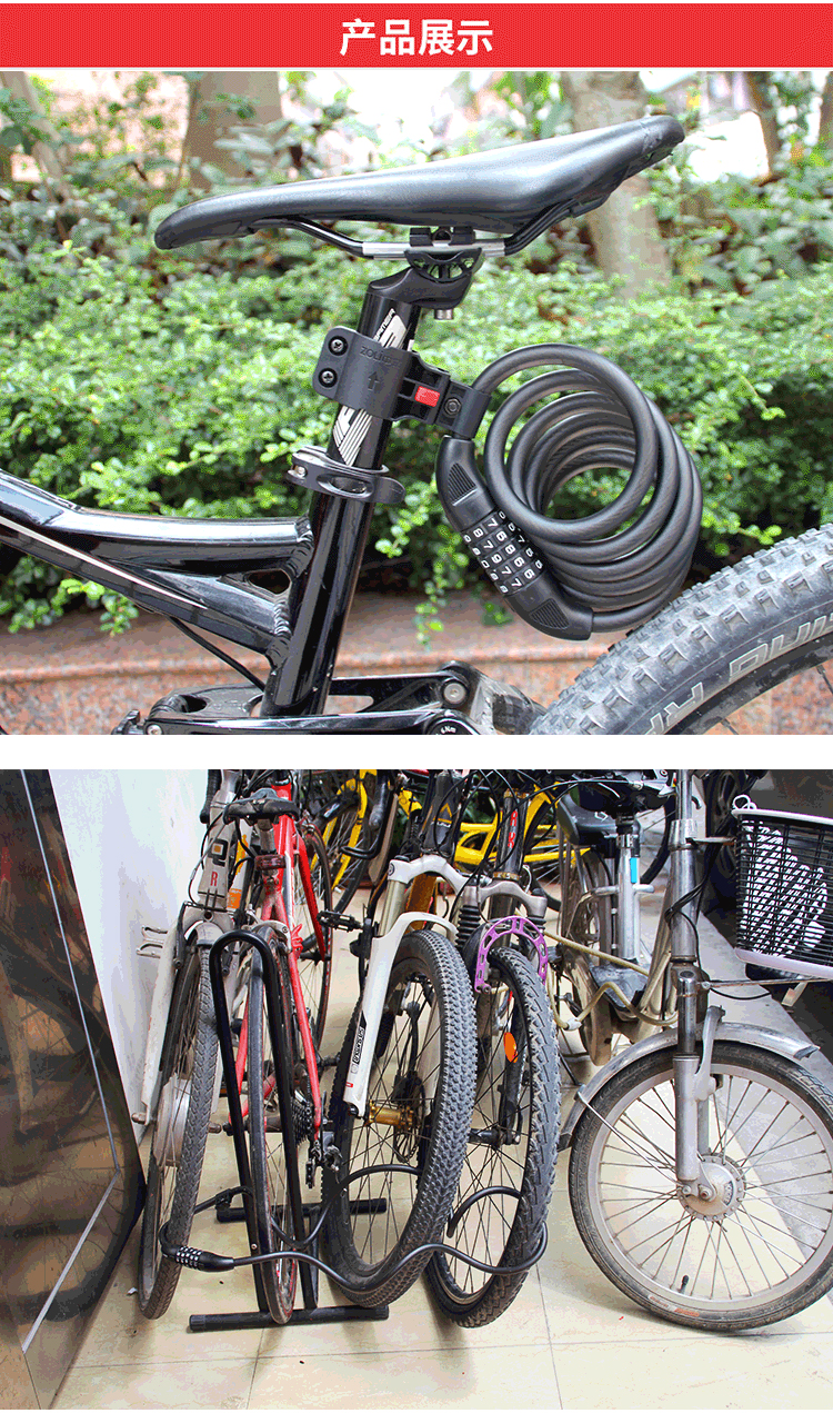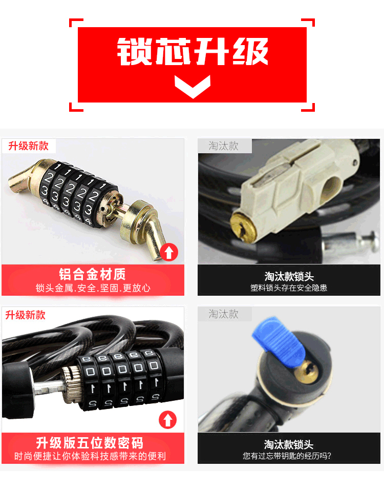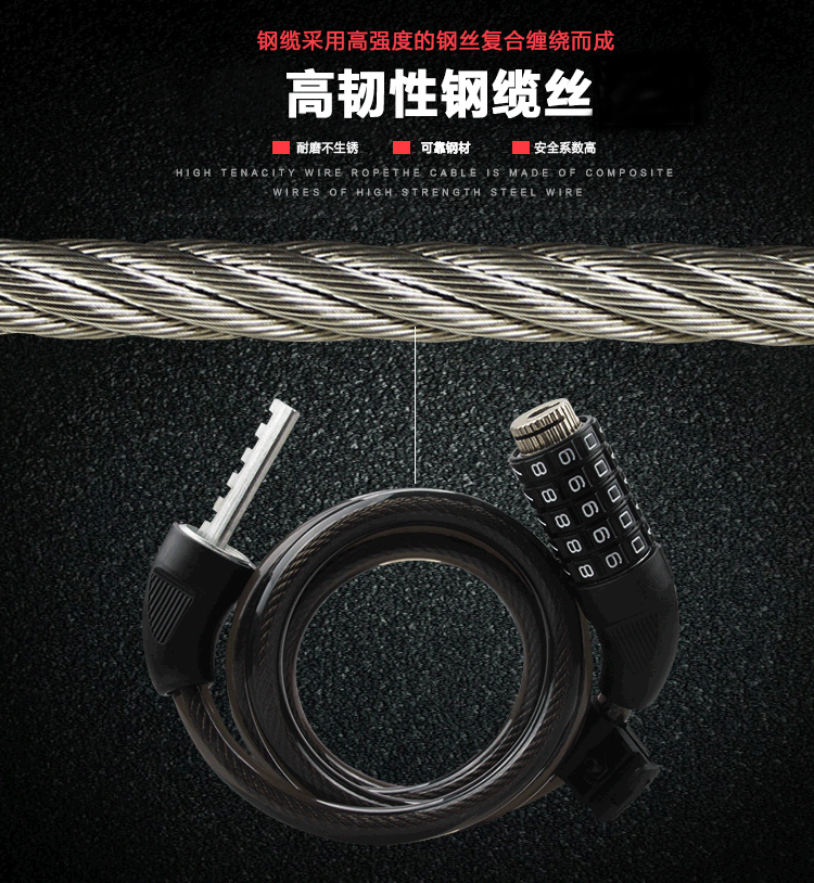 特色:五位數(shù)密碼鎖,時(shí)尚便捷免鑰匙,1.2米合金鋼纜想怎么鎖就怎么鎖,鋁合金鎖芯更牢固,帶鎖架方便使用