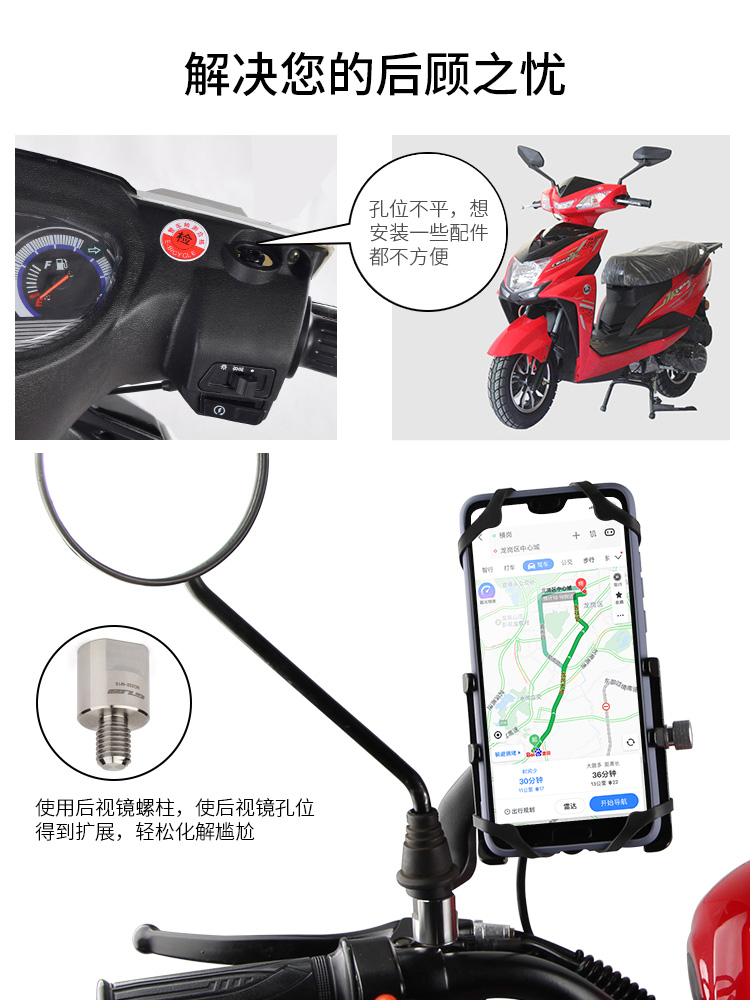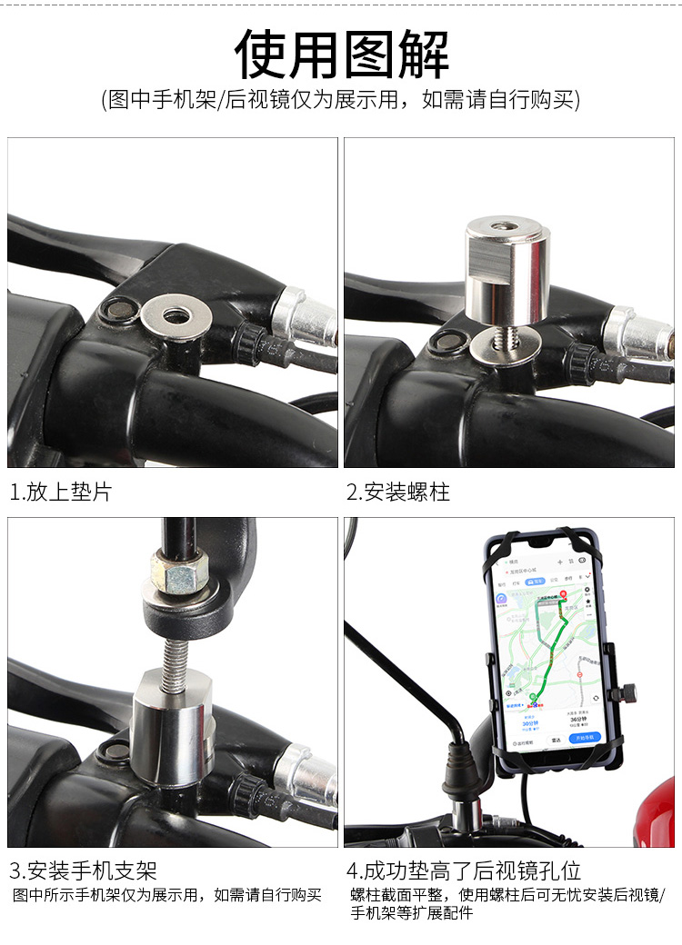 簡(jiǎn)介:此配件為后視鏡輔助配件,采用不銹鋼材質(zhì),耐用不生銹,用于摩托車(chē)/電動(dòng)車(chē)后視鏡孔位的擴(kuò)展,起到墊高或更好適配的作用。