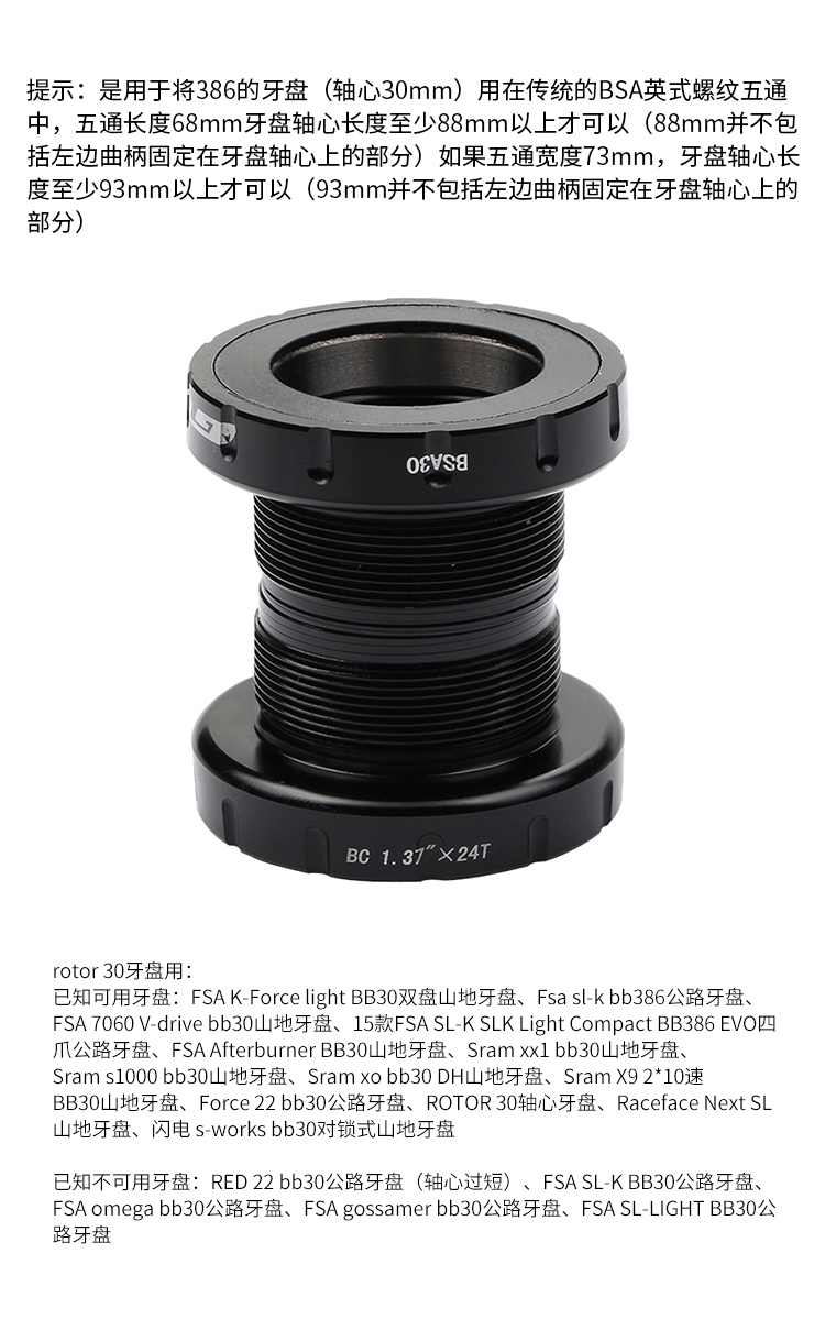 提示:是用于將386的牙盤(軸心30mm)用在傳統(tǒng)的BSA英式螺紋五通中,五通長度68mm