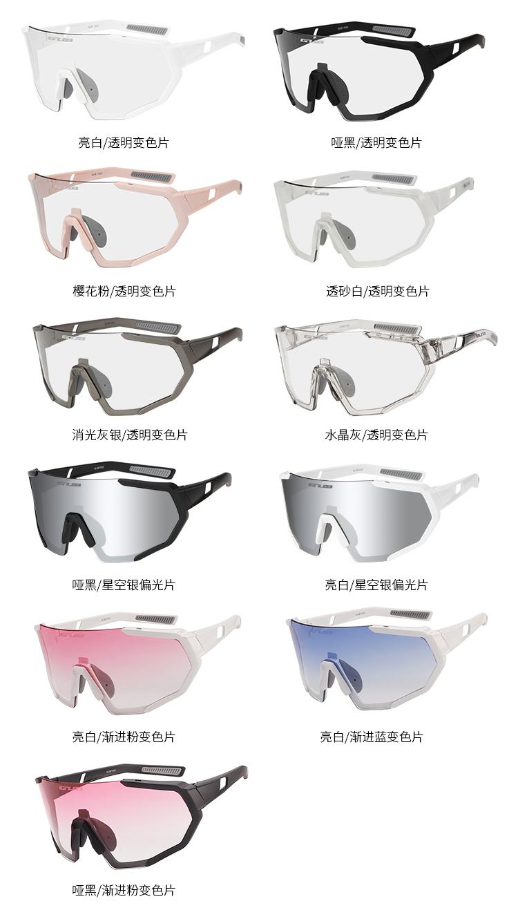 顏色:啞黑/透明變色片、亮白/透明變色片、櫻花粉/透明變色片、消光灰銀/透明變色片、透砂白/透明變色片、水晶灰/透明變色片、啞黑/星空銀偏光片、亮白/星空銀偏光片、亮白/漸進粉變色片、亮白/漸進藍變色片、啞黑/漸進粉變色片
