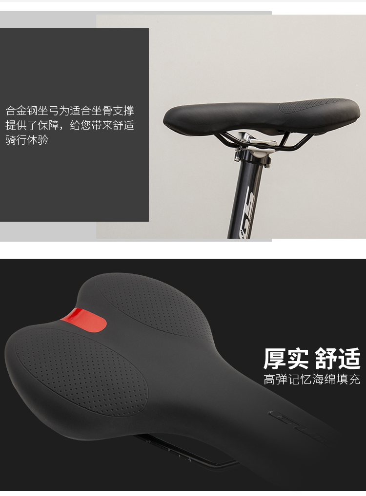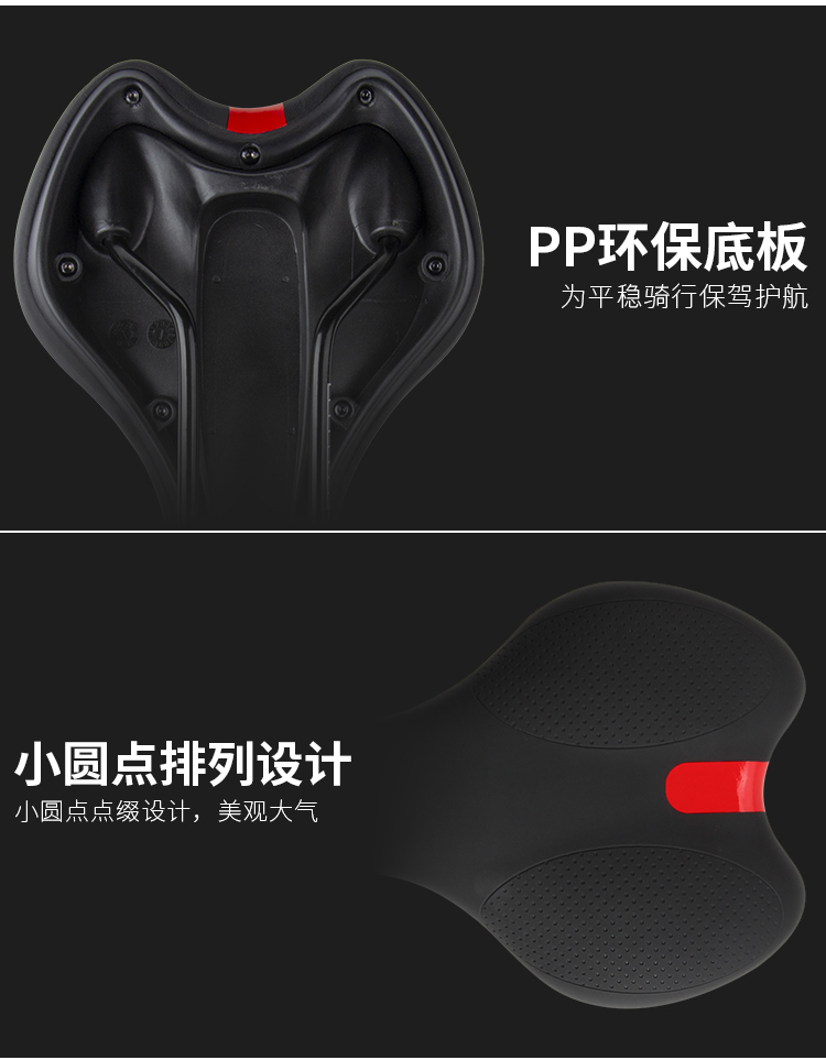 特色:高彈記憶海綿填充,舒適寬厚,合金鋼弓+PP底板,平穩(wěn)輸出,安心騎行!