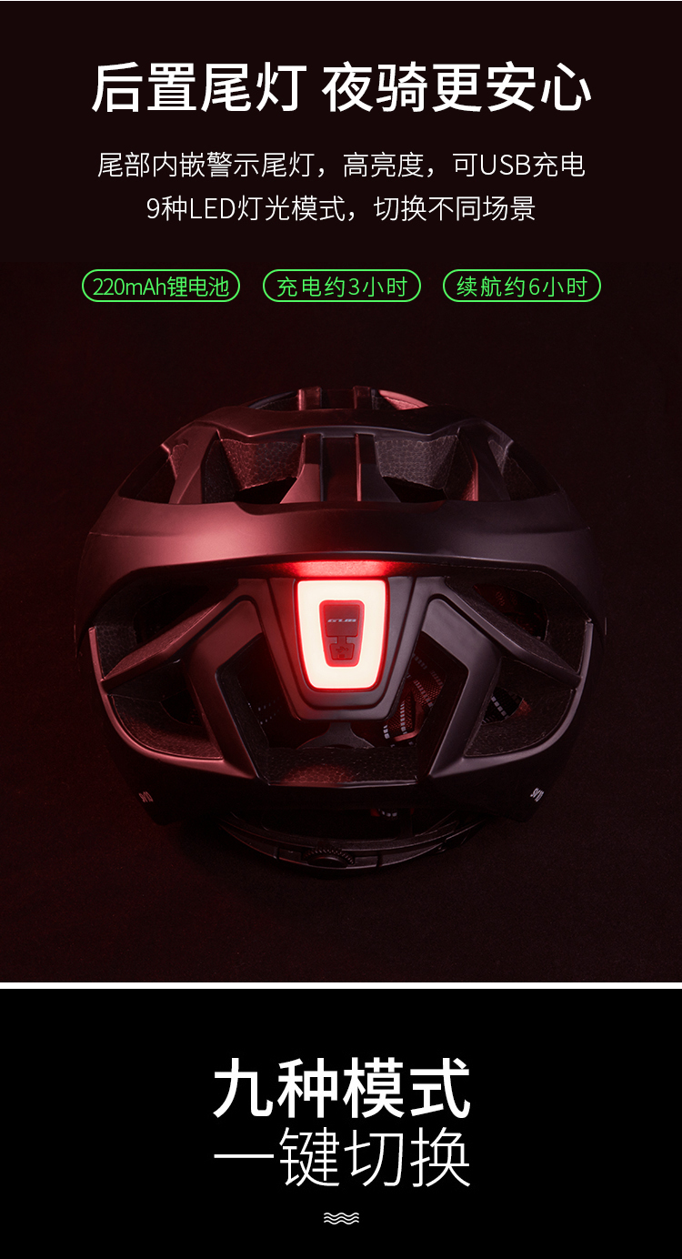 特色:帶USB充電尾燈(九種模式),一體成型,造型時尚,多通風(fēng)孔設(shè)計,多色可選。