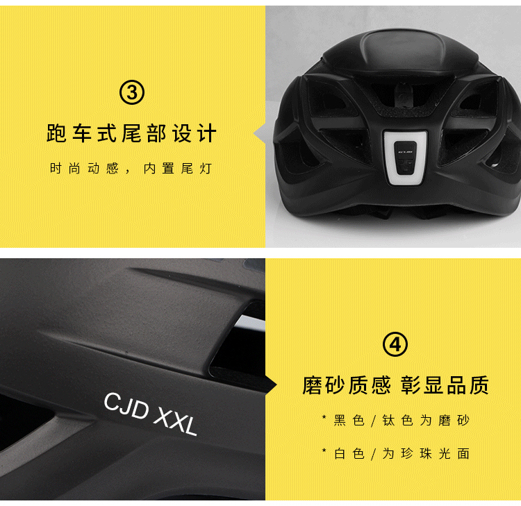 特色:超大頭圍,帶USB充電尾燈(九種模式),一體成型,造型時(shí)尚,多通風(fēng)孔設(shè)計(jì),多色可選。
