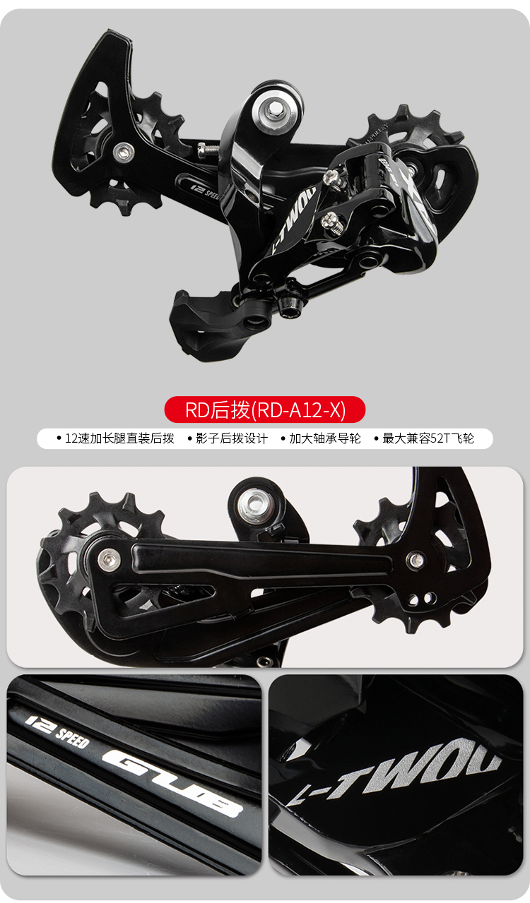 后撥:12速加長腿直裝后撥,影子后撥設(shè)計,加大軸承導(dǎo)輪,最大兼容52T飛輪