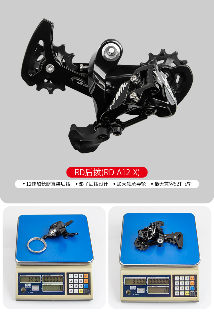 后撥:12速加長(zhǎng)腿直裝后撥,影子后撥設(shè)計(jì),加大軸承導(dǎo)輪,最大兼容52T飛輪