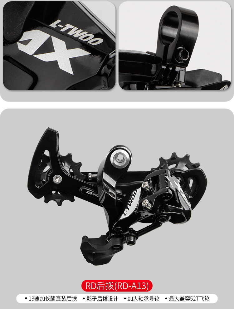 后撥:13速加長腿直裝后撥,影子后撥設(shè)計,加大軸承導輪,最大兼容52T飛輪