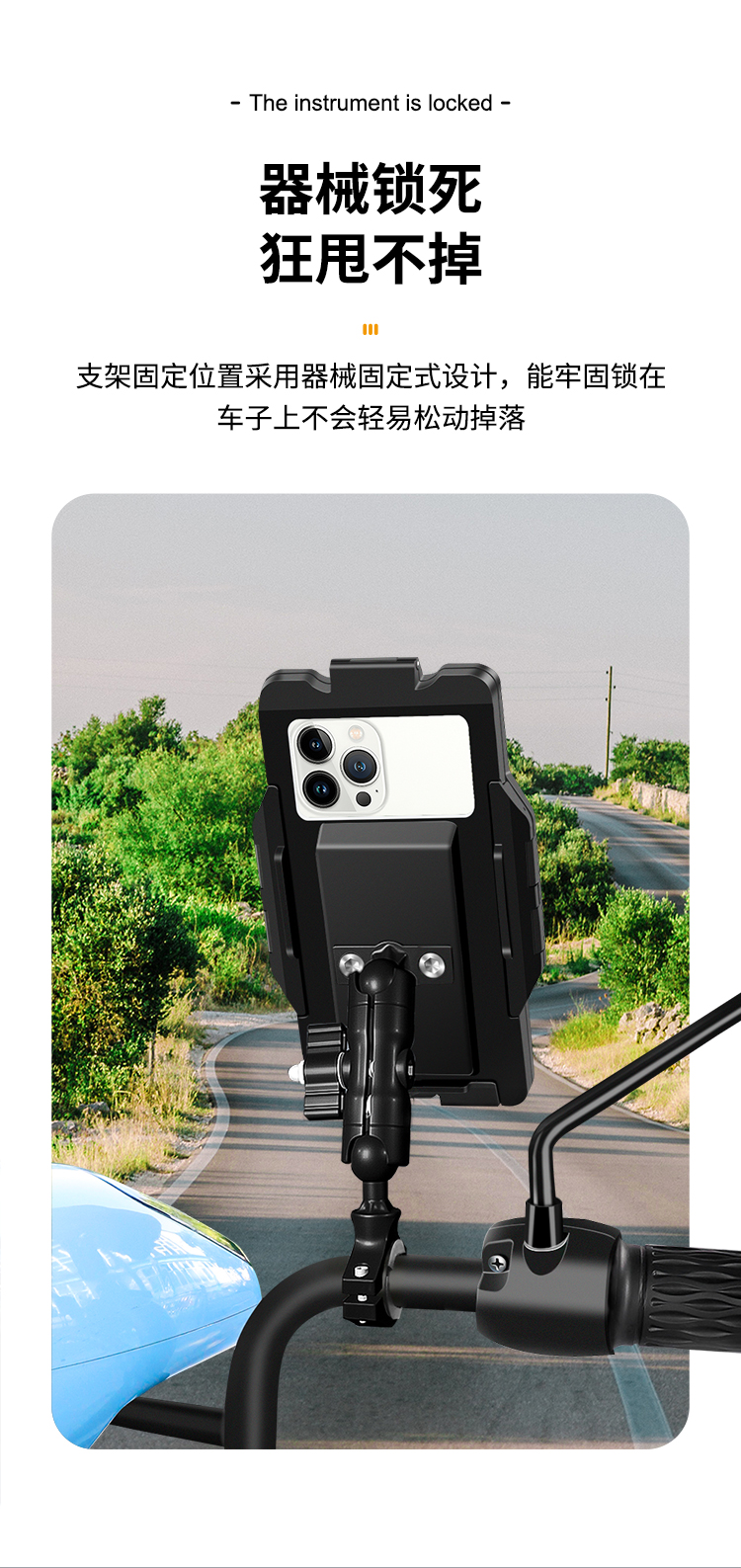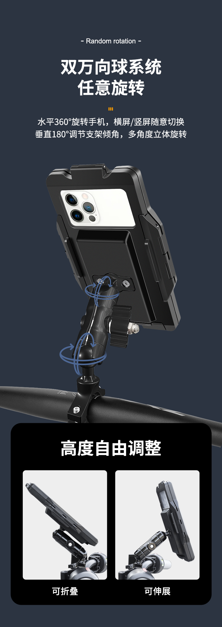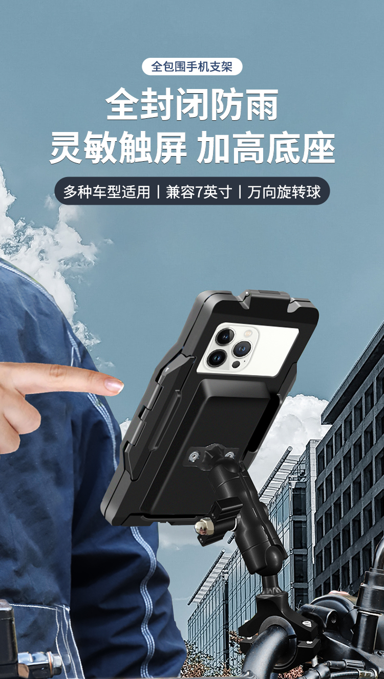 特點:鋁合金支撐架,全封閉手機盒,防雨無憂,高兼容性不挑手機型號,摩托車、電動車等都可使用,滿足多場景使用需求。