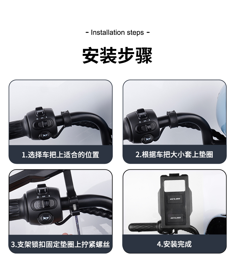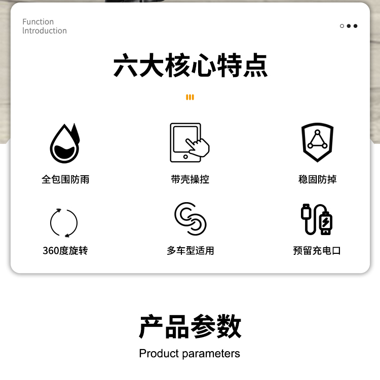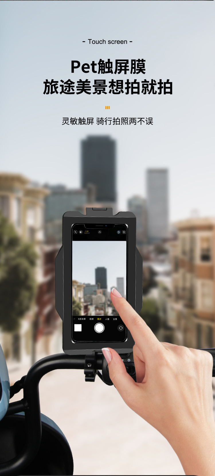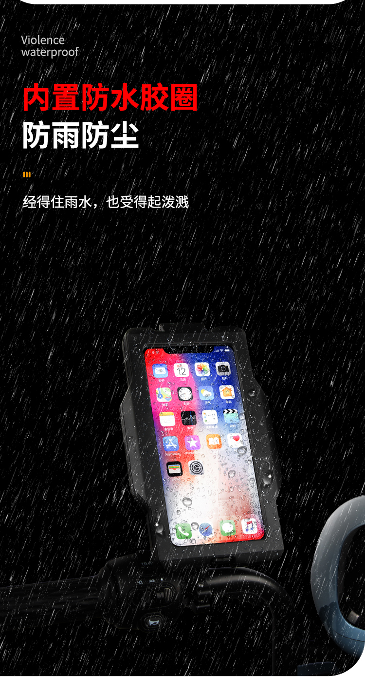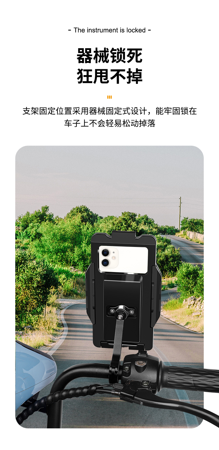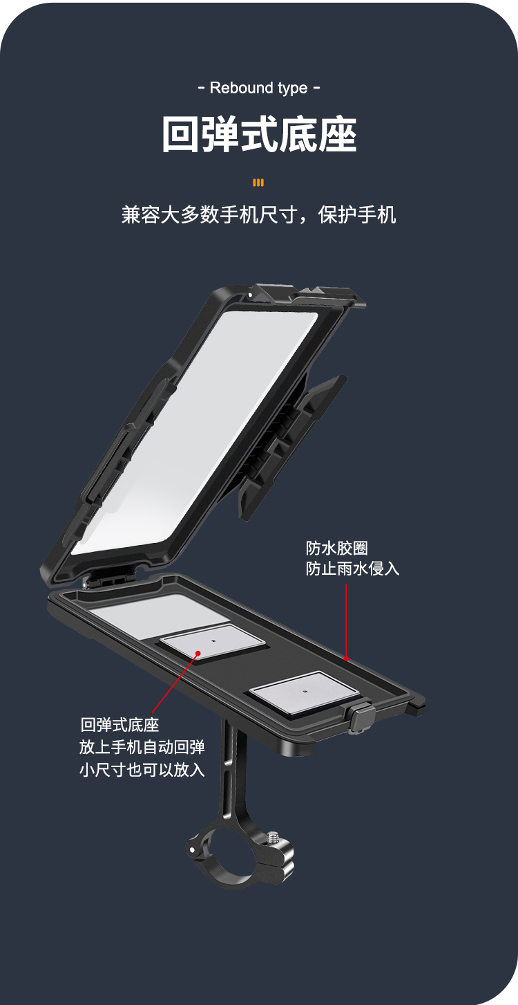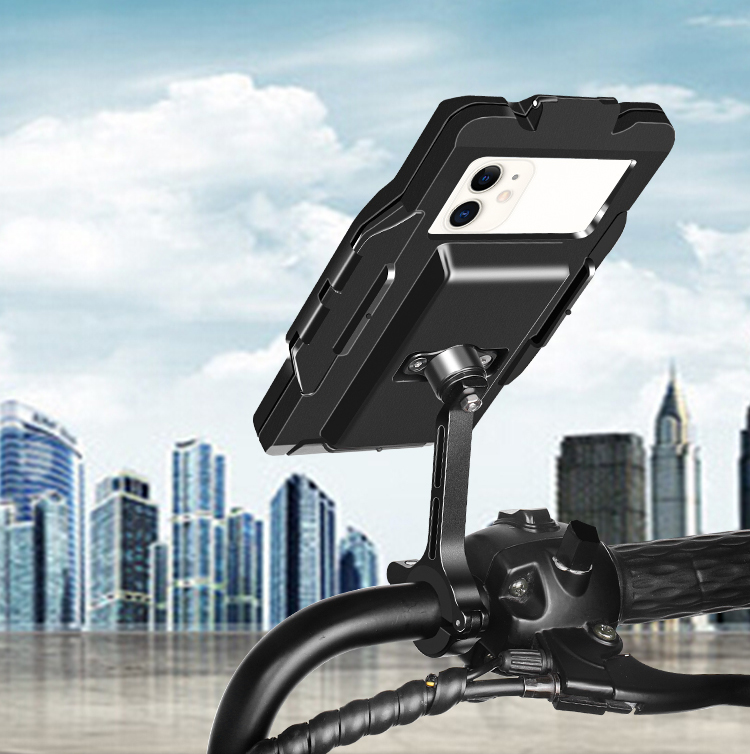 特點(diǎn):鋁合金支撐架,全封閉手機(jī)盒,防雨無憂,高兼容性不挑手機(jī)型號,摩托車、電動車等都可使用,滿足多場景使用需求。
