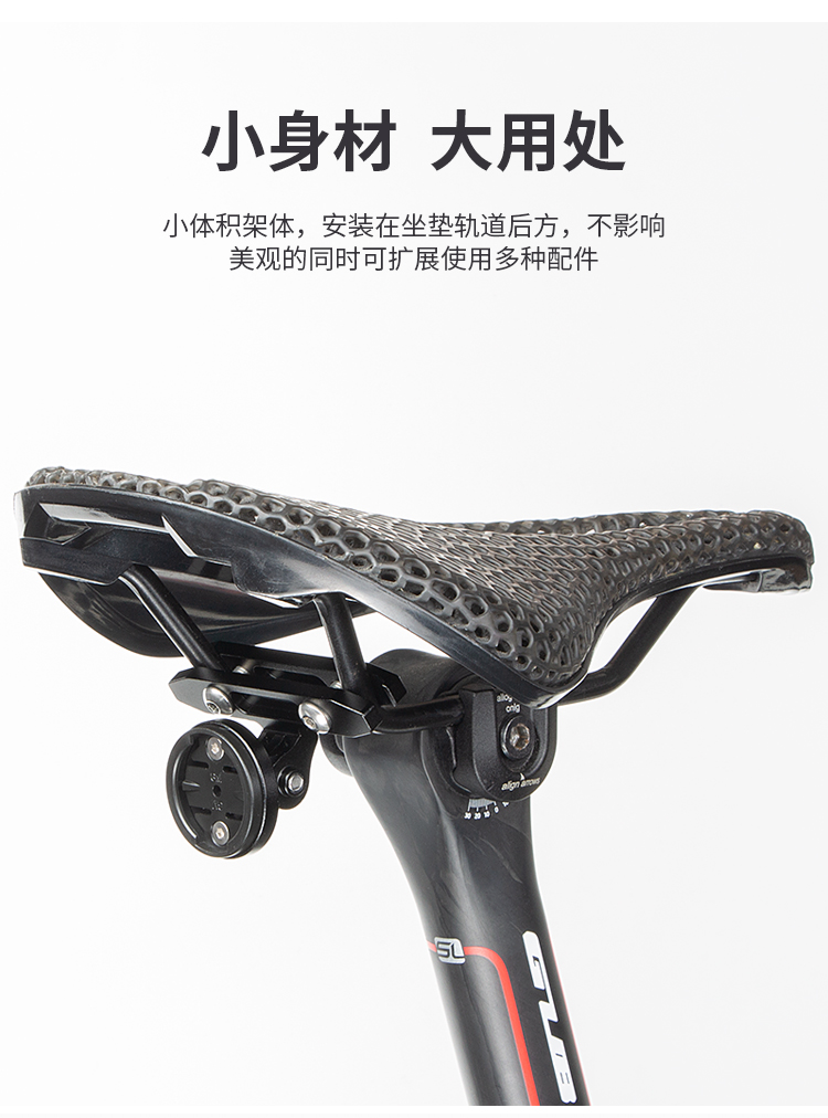 特點(diǎn):鋁合金材質(zhì)堅(jiān)固耐用,安裝在坐墊軌道后方,標(biāo)配佳明接口支架,適用于佳明接口的尾燈安裝,也可以直接安裝GOPRO運(yùn)動(dòng)相機(jī)等配件