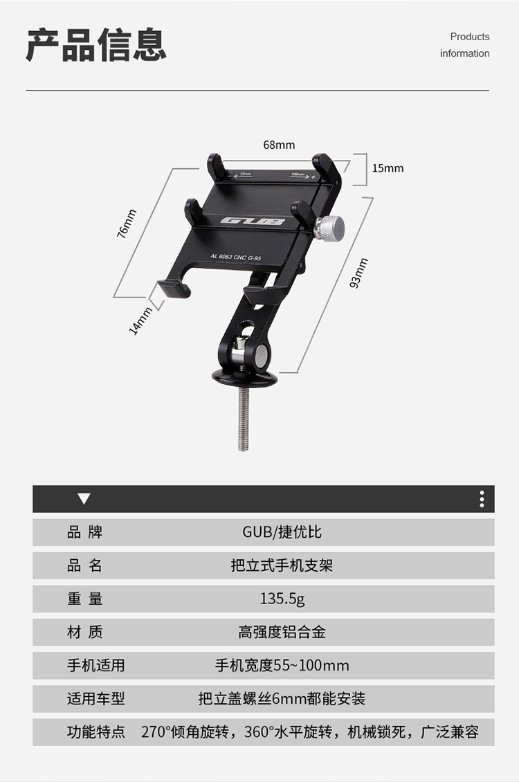名稱:GUB G-95 旋轉款鋁合金手機支架(碗組蓋固定)
