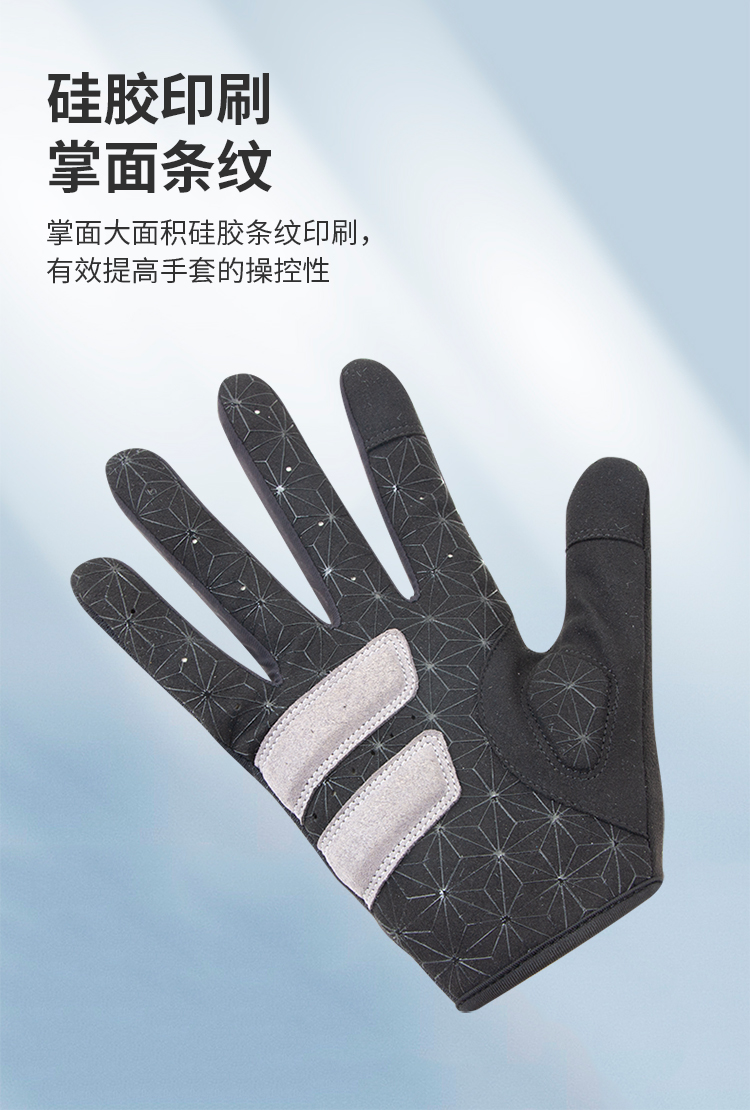 特點(diǎn):簡約設(shè)計(jì)、貼合手掌,手背高彈透氣面料,手掌大面積硅膠印刷條紋,防滑效果好,支持觸屏