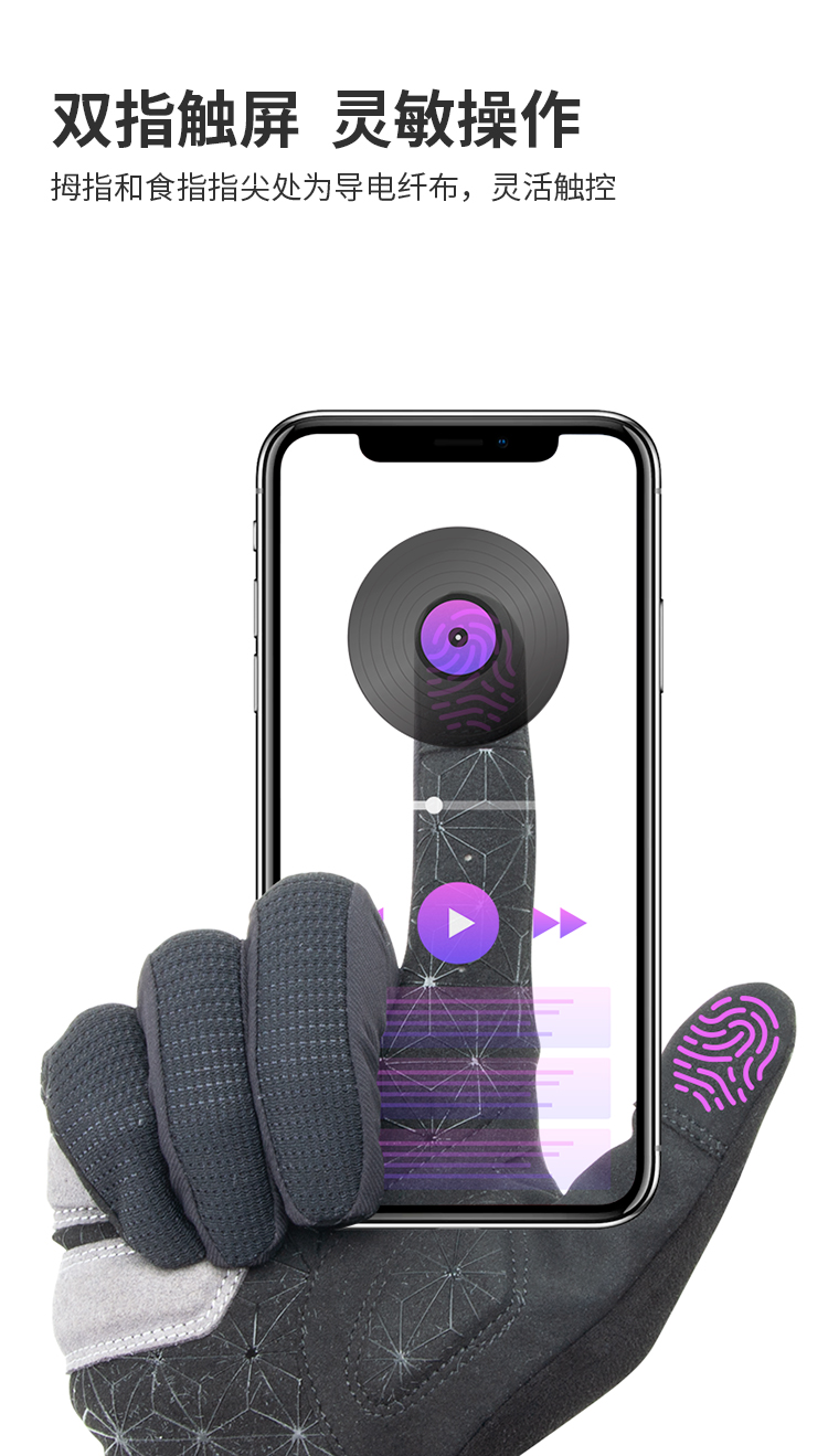 材質(zhì):高彈布料、SBR掌墊、硅膠印刷掌面條紋、拇指食指導(dǎo)電布