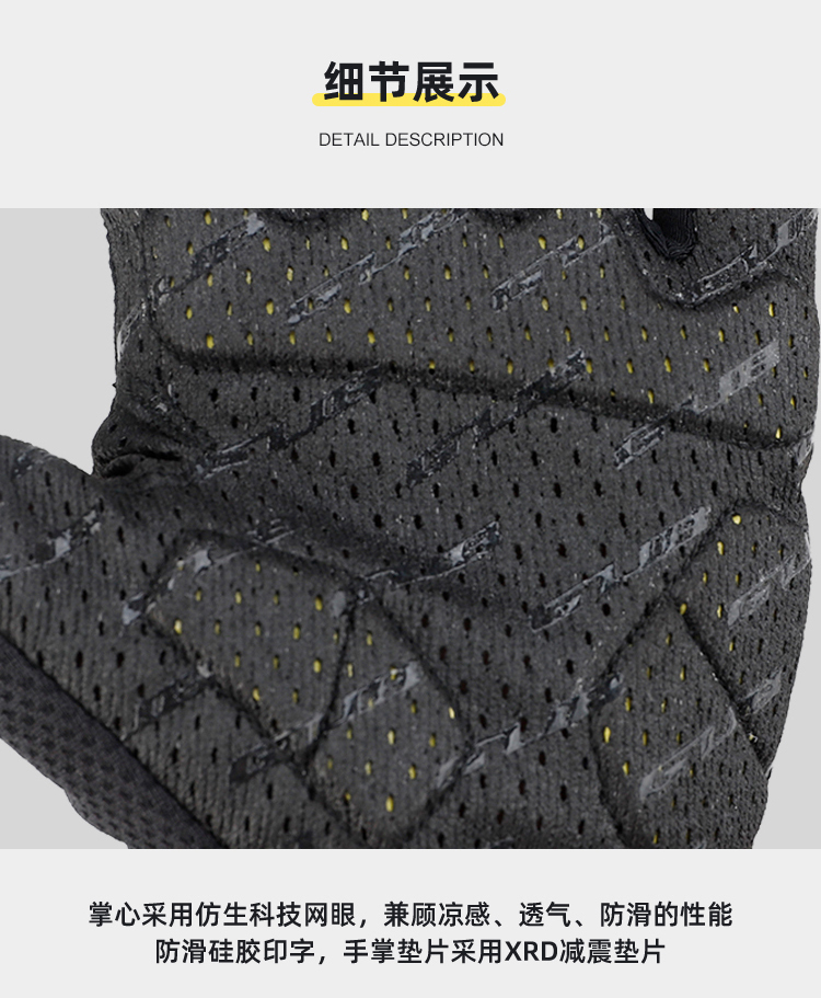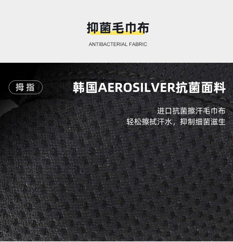 材質(zhì):華夫格高彈透氣面料、進(jìn)口PORON XRD 緩沖掌墊、掌心采用仿生科技網(wǎng)眼、韓國(guó)Aerosilver抗菌面料(擦汗布)