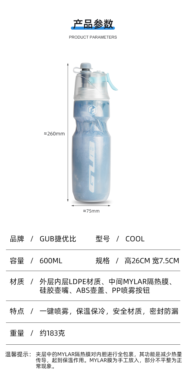 材質(zhì):外層內(nèi)層LDPE材質(zhì)、中間MYLAR隔熱膜、硅膠壺嘴、ABS壺蓋、PP噴霧按鈕