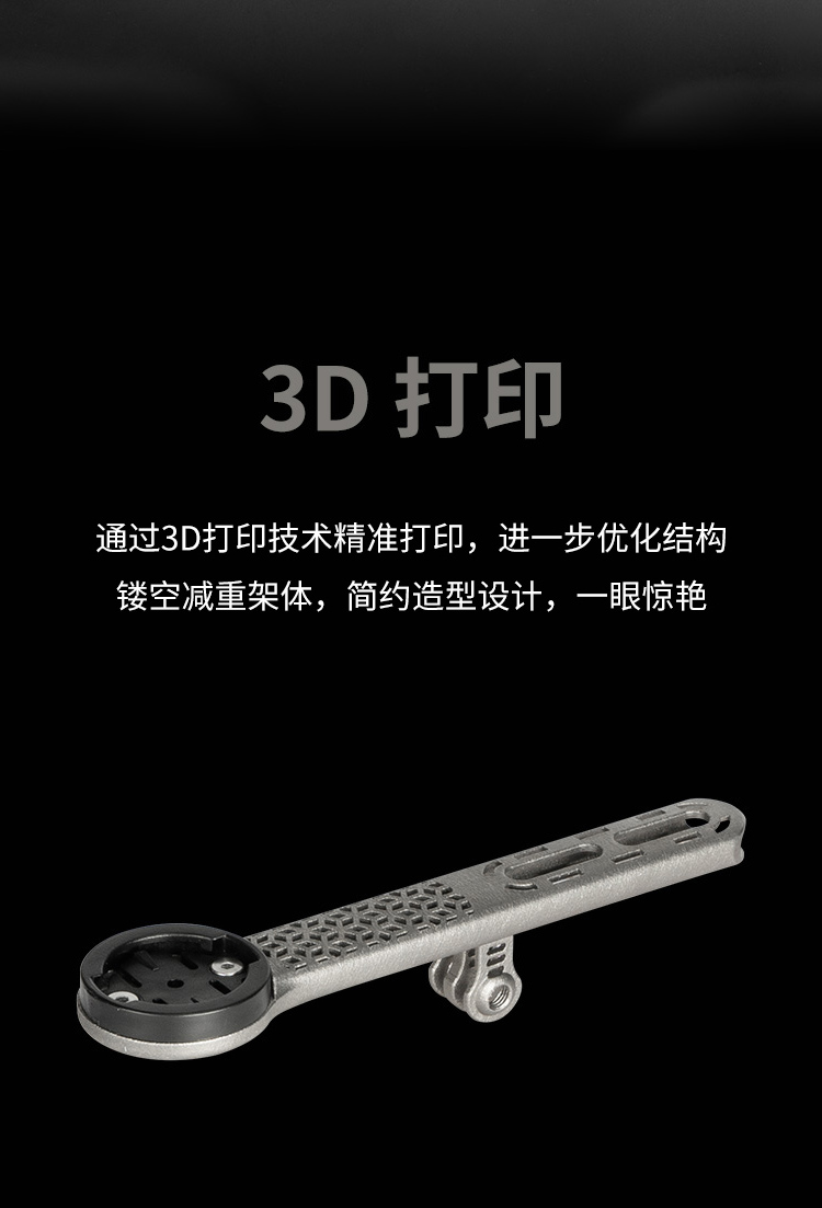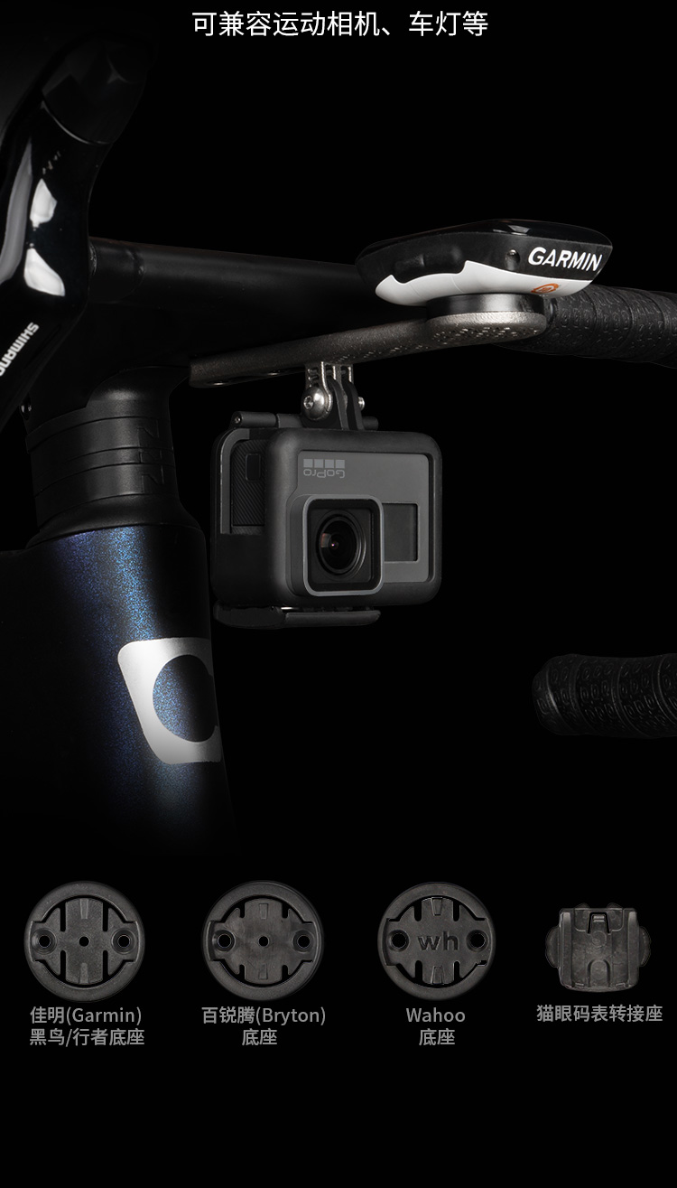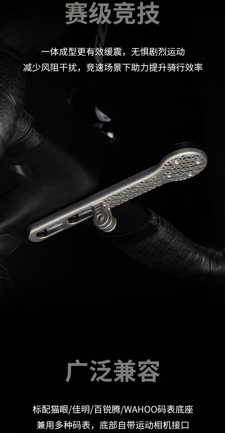 特點:鈦合金架體,3D打印工藝,居中安裝節(jié)省空間(一體把專用),兼容多種碼表,標配運動相機接座,可擴展使用運動相機等配件