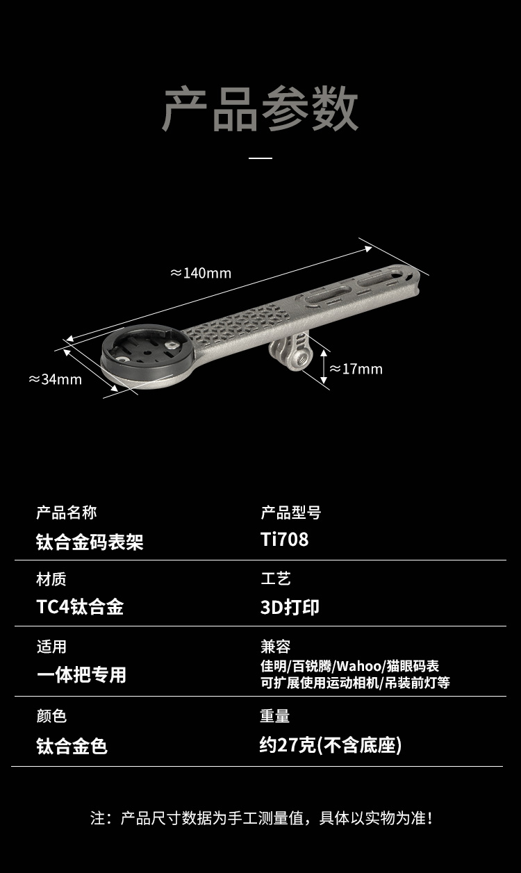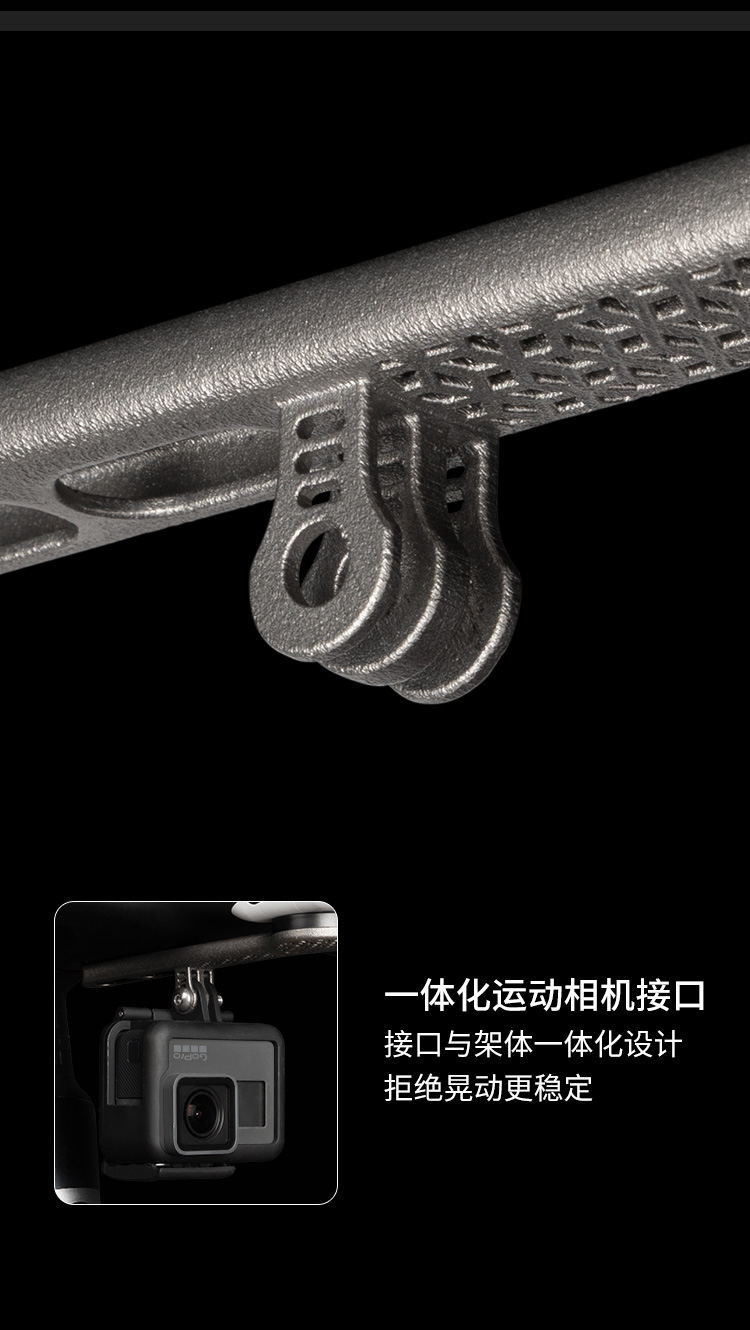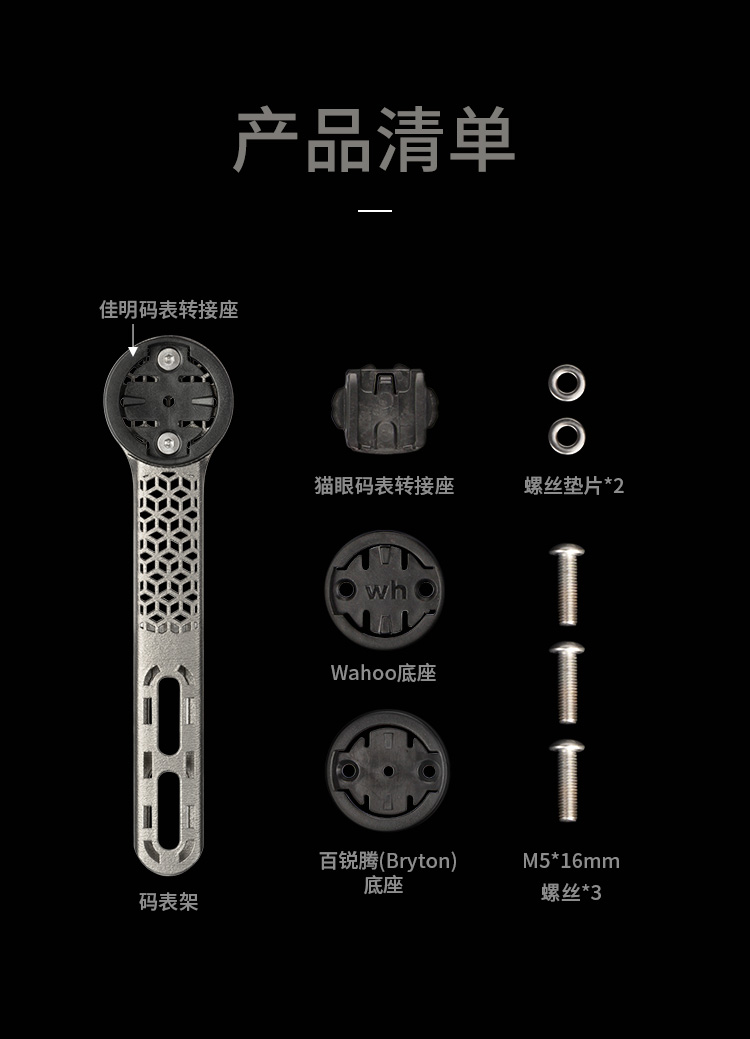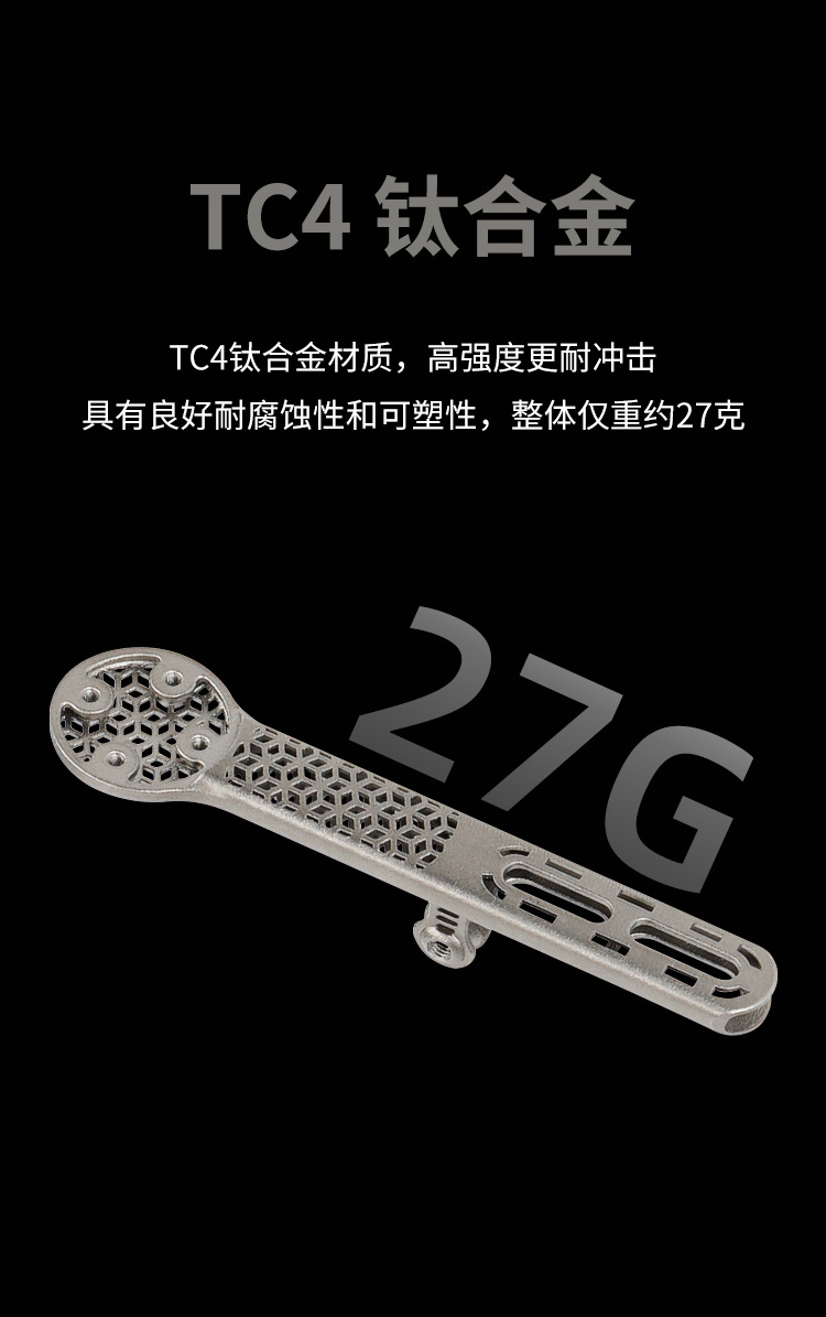 特點:鈦合金架體,3D打印工藝,居中安裝節(jié)省空間(一體把專用),兼容多種碼表,標配運動相機接座,可擴展使用運動相機等配件