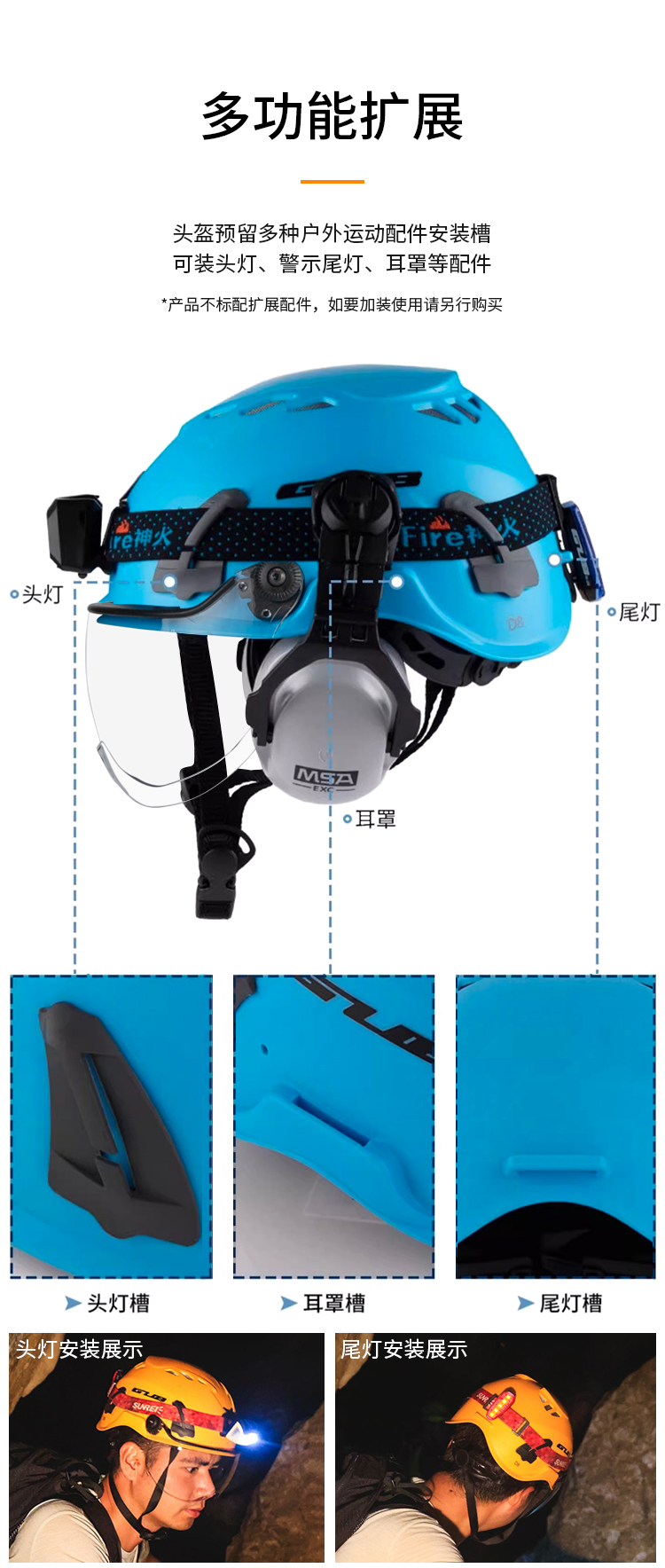 特色:簡(jiǎn)約大方的外觀設(shè)計(jì),升級(jí)可拆卸風(fēng)鏡,PP+EPS高強(qiáng)度外殼不懼強(qiáng)烈沖擊,貼心半包邊內(nèi)襯佩帶舒適,自帶頭燈卡扣,支持加裝頭燈。帶耳罩插口,可加裝防噪耳罩。